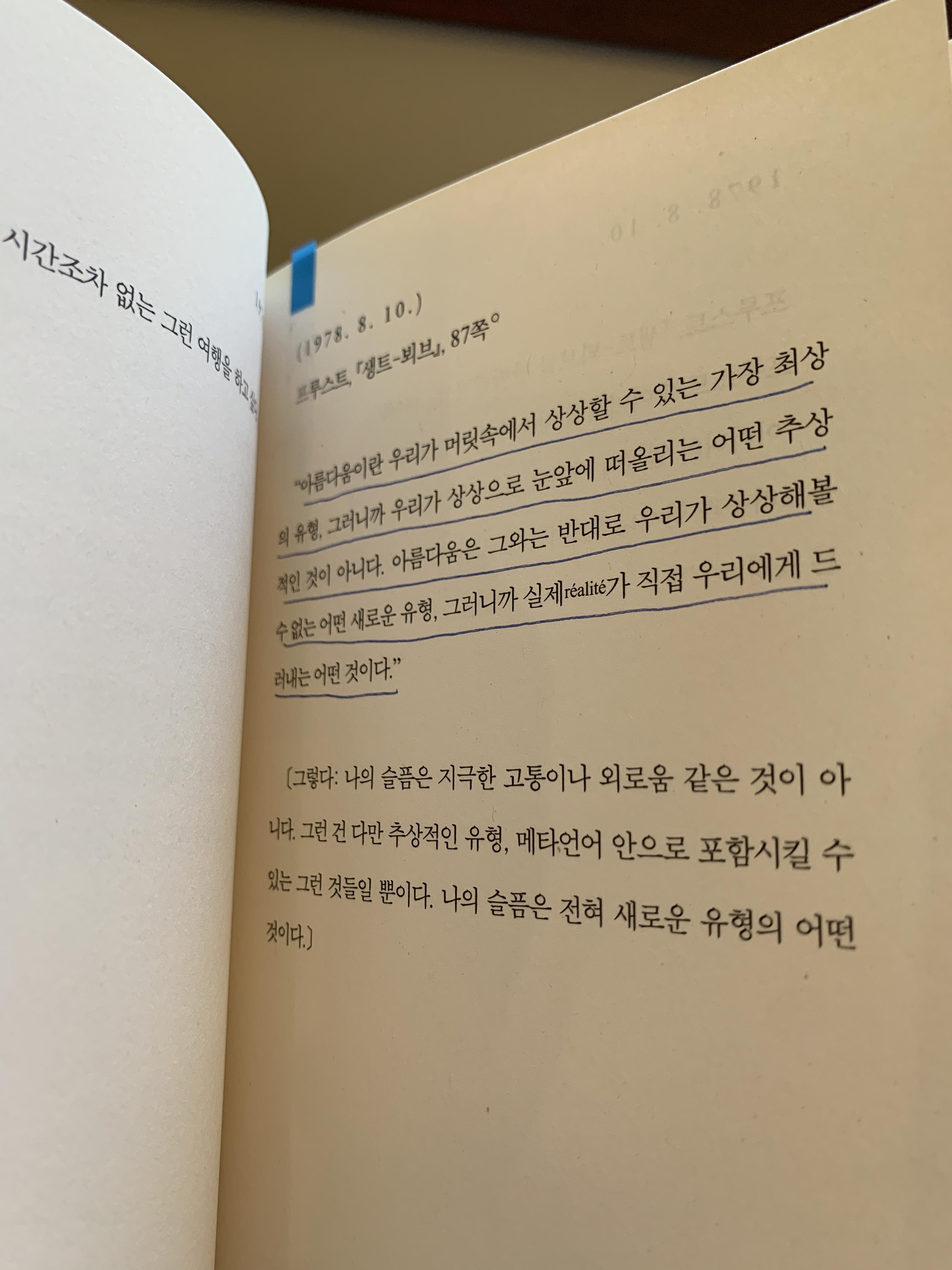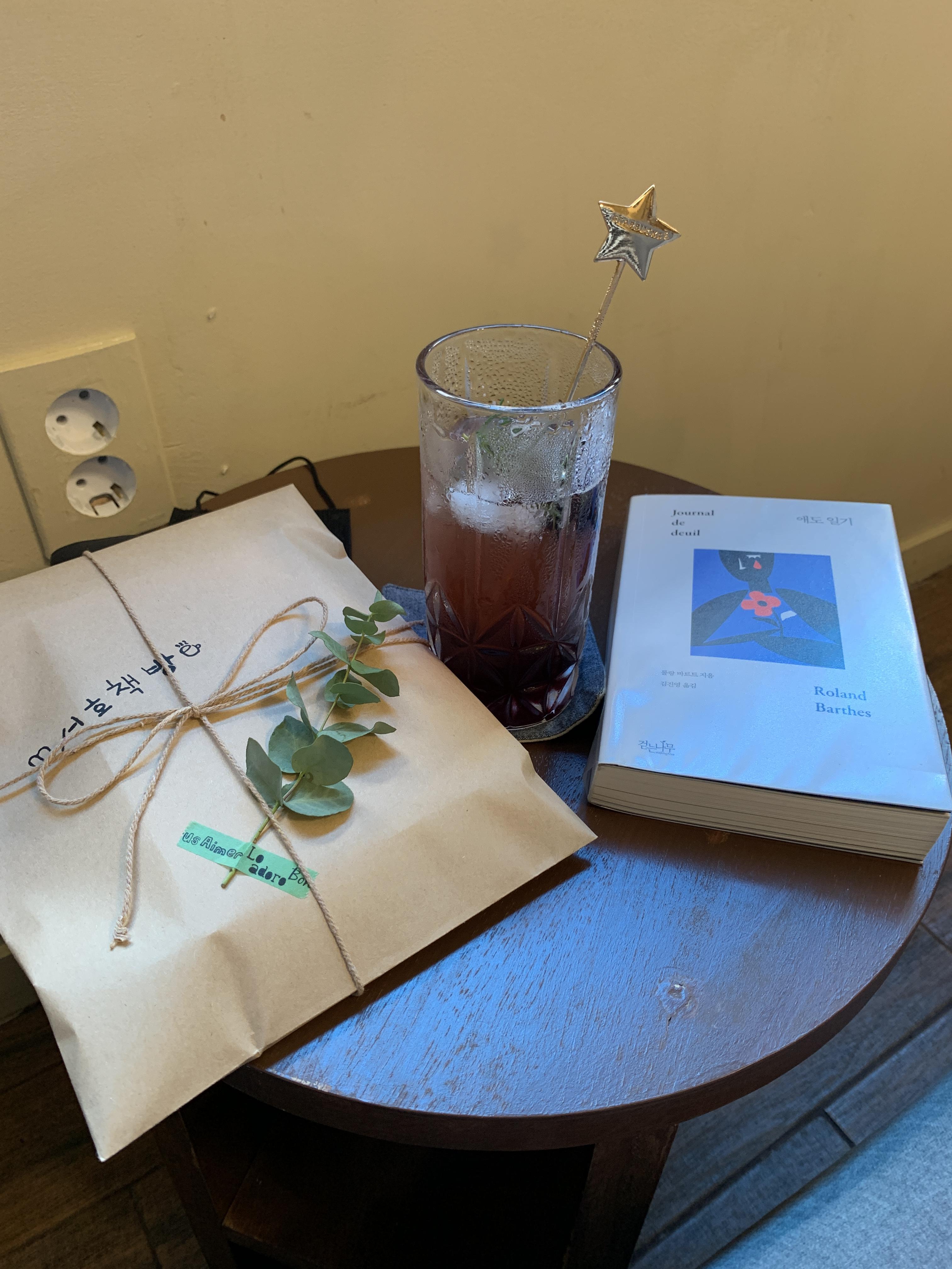 복분자 쥬스였나? 까먹었다. 시집 한권을 샀더니 저렇게 예쁘게 포장해주셨다. 롤랑 바르트의 책<애도일기>를 펼쳤다. 이 책에는 롤랑 바르트가 어머니의 죽음을 애도하며 쓴 글들이 담겨있는데, 저자의 슬픈 감정들이 묵직하게 느껴진다.