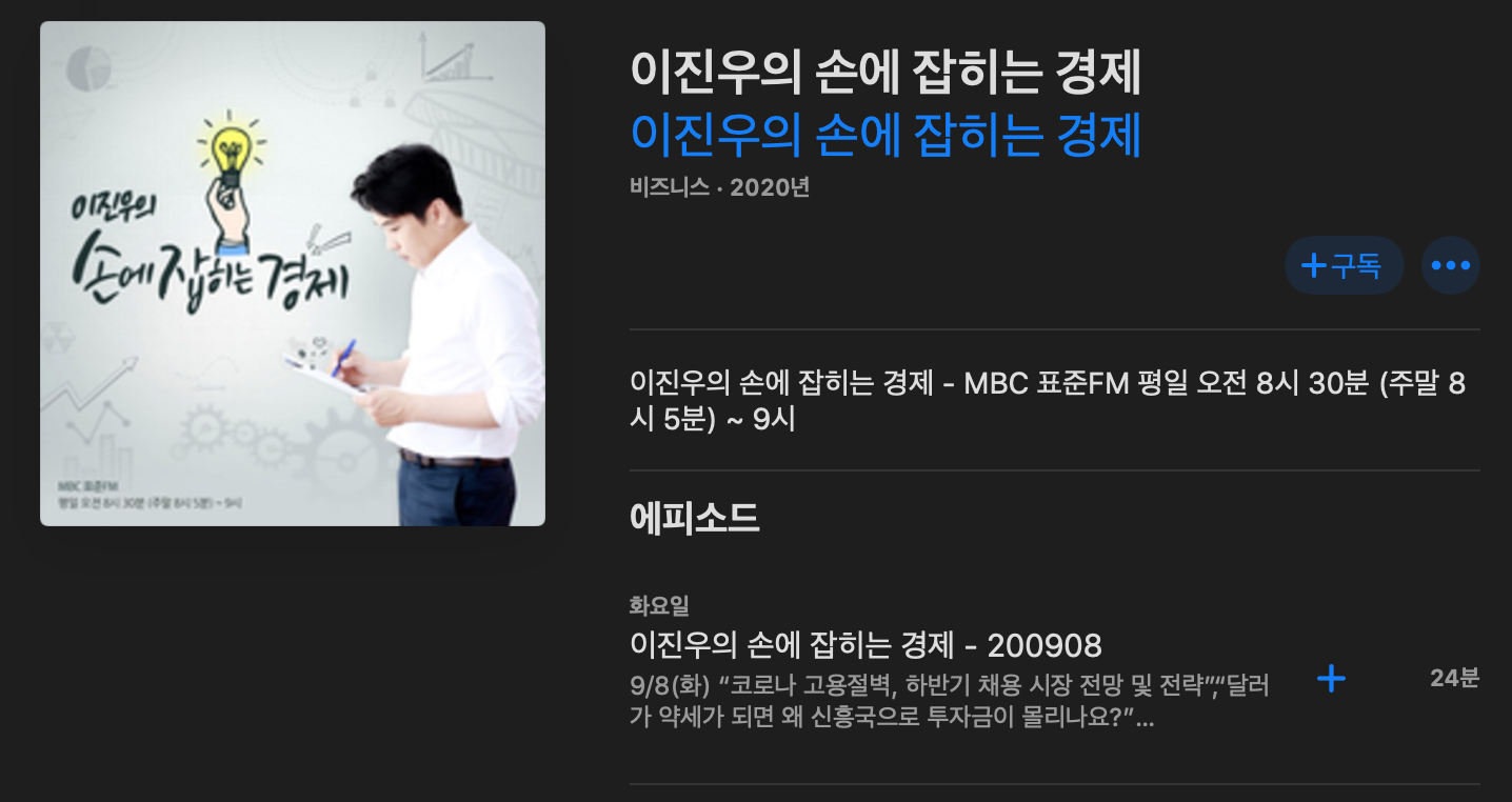 아침에 자가용을 타고 출근할 때마다 시간이 아깝다는 생각을 한다. 그래서 아침마다 팟캐스트 '이진우의 손에 잡히는 경제'를 듣는다.