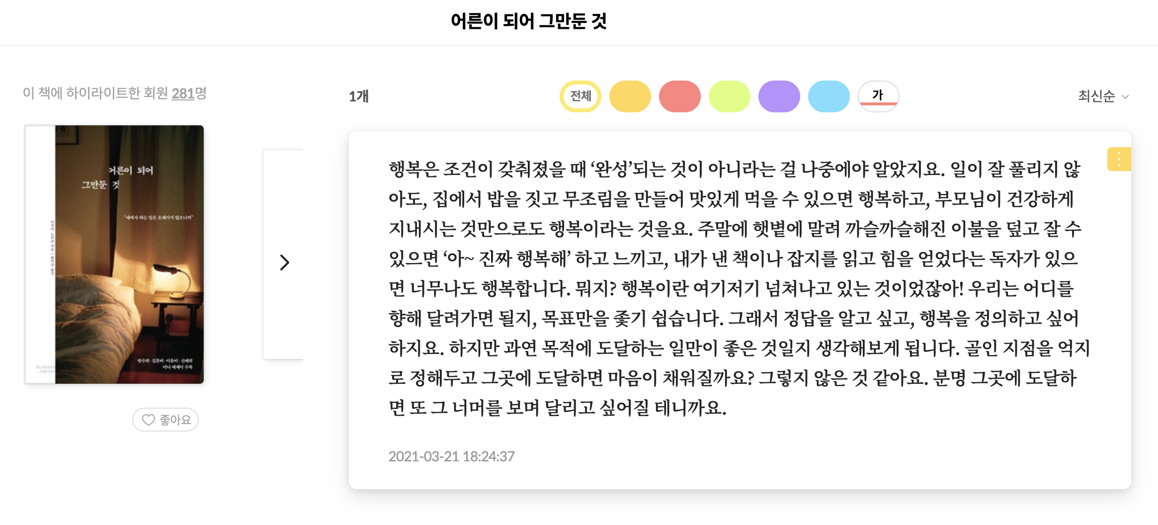 카테고리 없음 독서노트(545)어른이 되어 그만 둔 것 by 이야기캐는광부 2021. 5. 30. 반응형 행복한가. 행복해졌나. 앞으로 행복할까. 행복에 대한 질문은 멈추지 않는다. 매번 물을 때마다 답을 못 찾는다. 반응형 공유하기 게시글 관리 이야기캐는광부 저작자표시 비영리 변경금지 (새창열림) 댓글