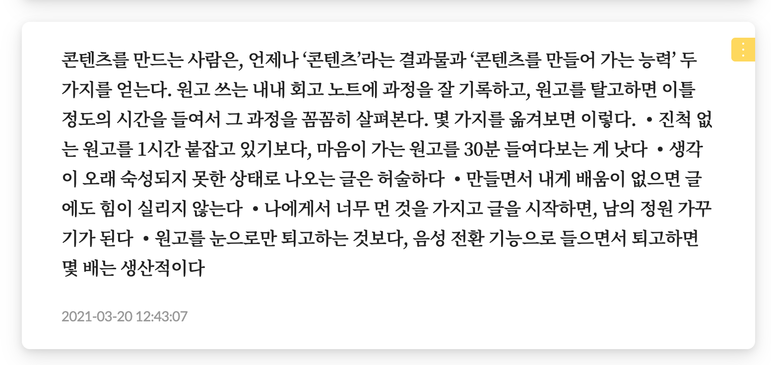 콘텐츠를 만드는 사람은, 언제나 '콘텐츠'라는 결과물과 '콘텐츠를 만들어 가는 능력' 두가지를 얻는다. 원고 쓰는 내내 회고 노트에 과정을 잘 기록하고, 원고를 탈고하면 이틀 정도의 시간을 들여서 그 과정을 꼼꼼히 살펴본다. 몇 가지를 옮겨보면 이렇다. 진척 없는 원고를 1시간 붙잡고 있기보다, 마음이 가는 원고를 30분 들여다보는 게 낫다. 생각이 오래 숙성되지 못한 상태로 나오는 글은 허술하다. 만들면서 내게 배움이 없으면 글에도 힘이 실리지 않는다. 나에게서 너무 먼 것을 가지고 글을 시작하면, 남의 정원 가꾸기가 된다. 원고를 눈으로만 퇴고하는 것보다, 음성 전환 기능으로 들으면서 퇴고하면 몇 배는 생산적이다.