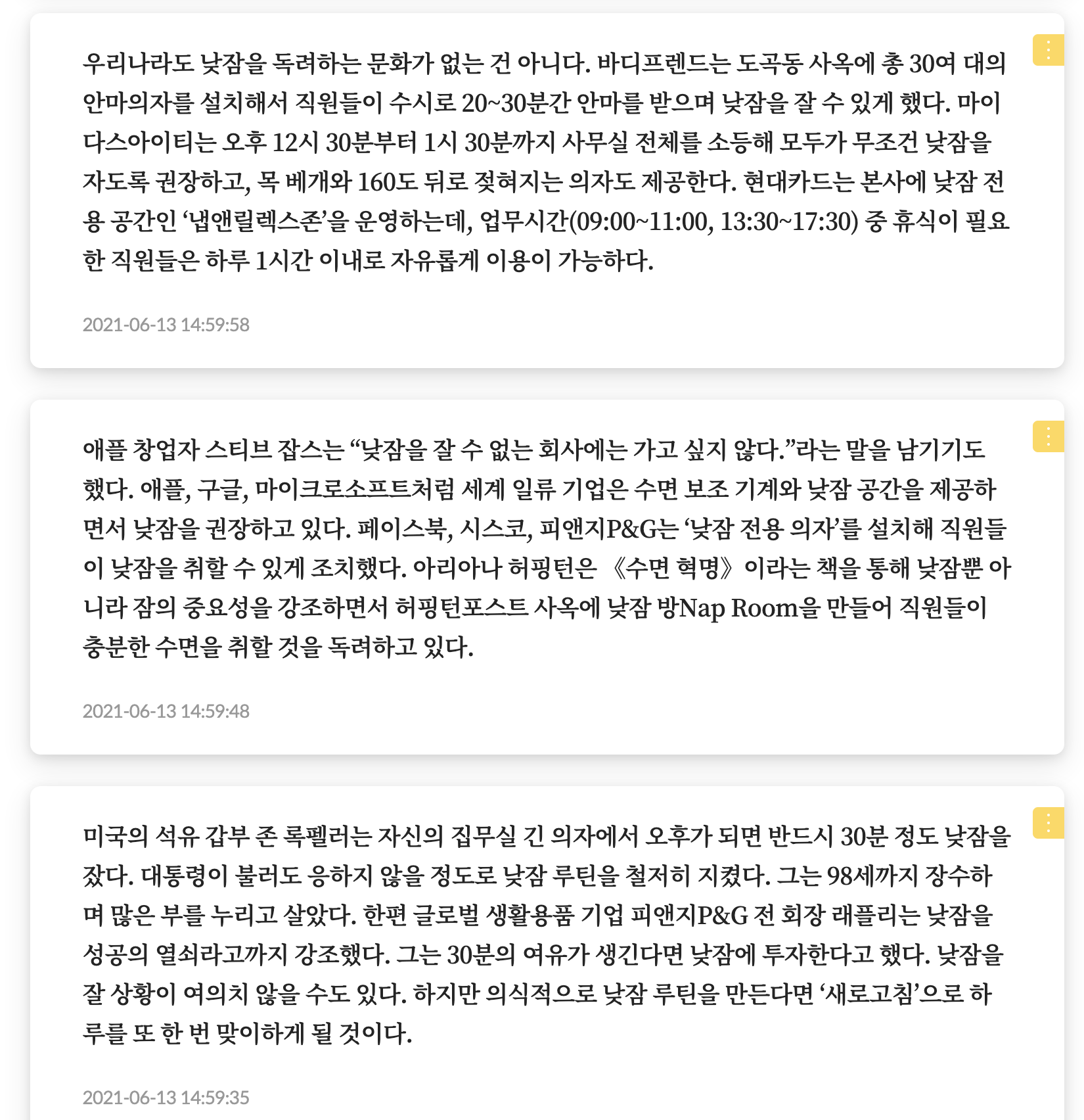 책<데일리루틴>에 나오는 '낮잠'관련 이야기이다. 낮잠은 생산성을 높이는데 효과가 있나보다. 실제 사무실에서 낮잠 자는게 눈치 보이는게 사실이다. 코를 안 골면 다행인데, 코를 골면 낮잠 자기도 어렵다. 나도 낮잠을 즐기는 편이다. 점심 시간에 차 운전석에서 낮잠을 주로 잔다. 얼른 퇴근하고 싶다는 마음을 품고서.