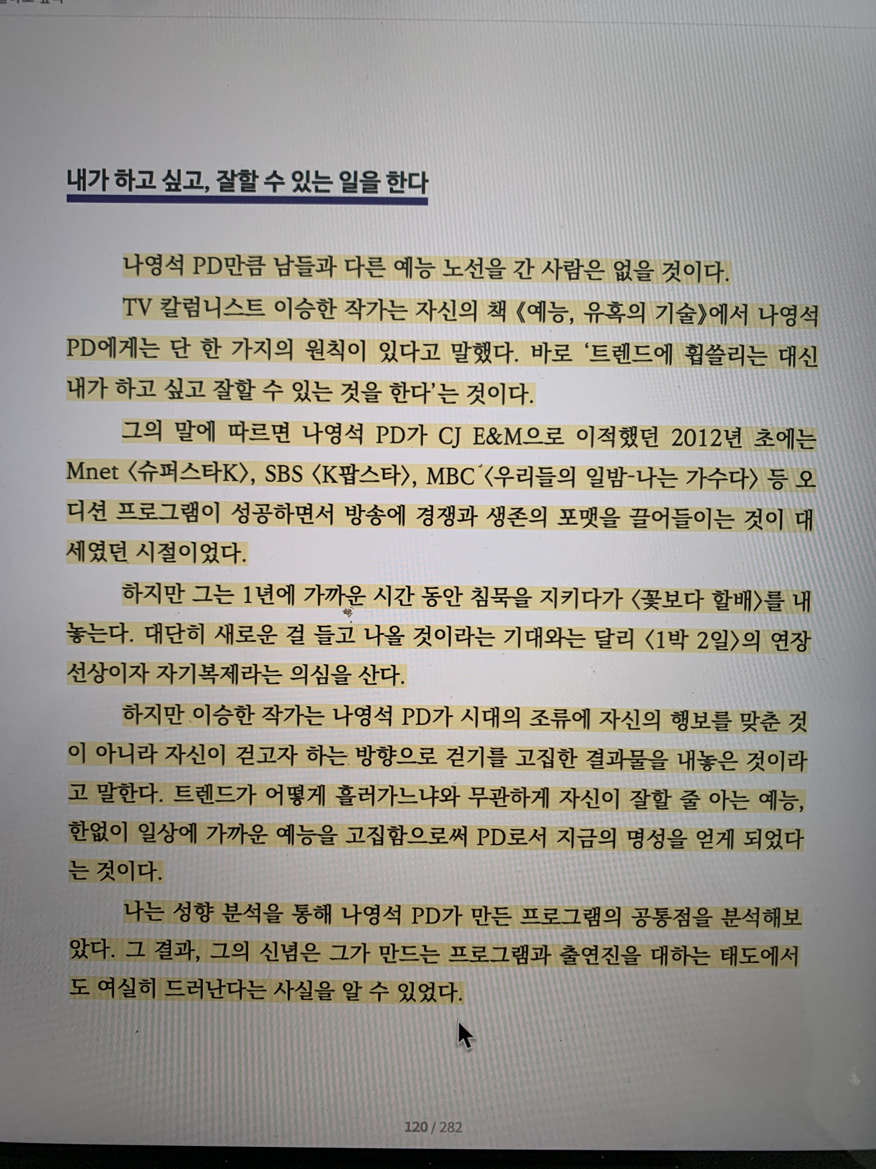 하지만 이승한 작가는 나영석 PD가 시대의 조류에 자신의 행보를 맞춘 것이 아니라 자신이 걷고자 하는 방향으로 걷기를 고집한 결과물을 내놓은 것이라고 말한다. 트렌드가 어떻게 흘러가느냐와 무관하게 자신이 잘할 줄 아는 예능, 한없이 일상에 가까운 예능을 고집함으로써 PD로서 지금의 명성을 얻게 되었다는 것이다.