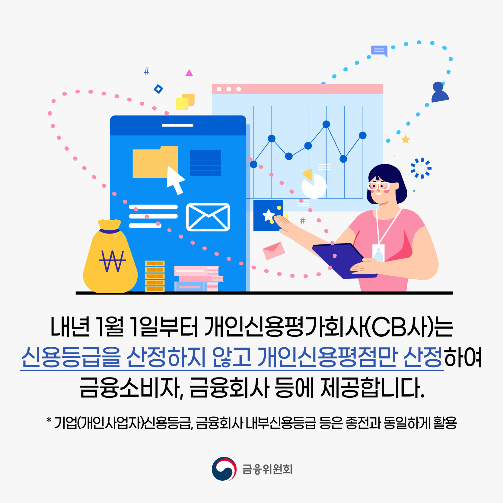 2021년 1월 1일분터 개인신용평가회사(CB사)는 신용등급을 산정하지 않고 개인신용평점만 산정하여 금융소비자, 금융회사 등에 제공하고요. 기업(개인사업자)신용등급, 금융회사 내부신용등급 등은 종전과 동일하게 활용됩니다. 금융소비자는 CB사가 제공하는 신용평점과 누적순위, 맞춤형 신용관리 팁 등을 이용, 자신의 신용도를 손쉽게 관리할수 있습니다.
