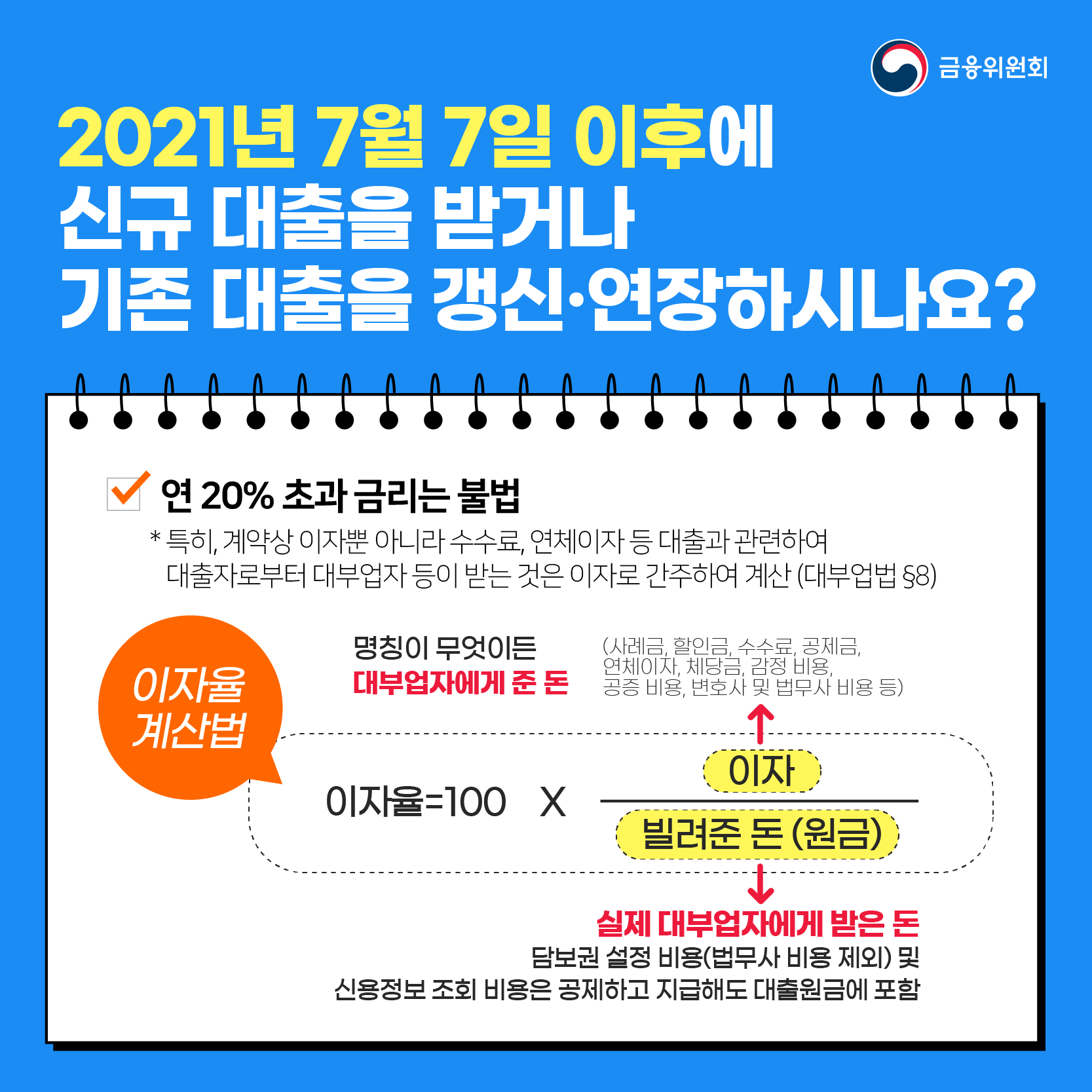 7월 7일 이후 새로운 계약에서 연 20% 초과 금리를 수취하는 불법행위는