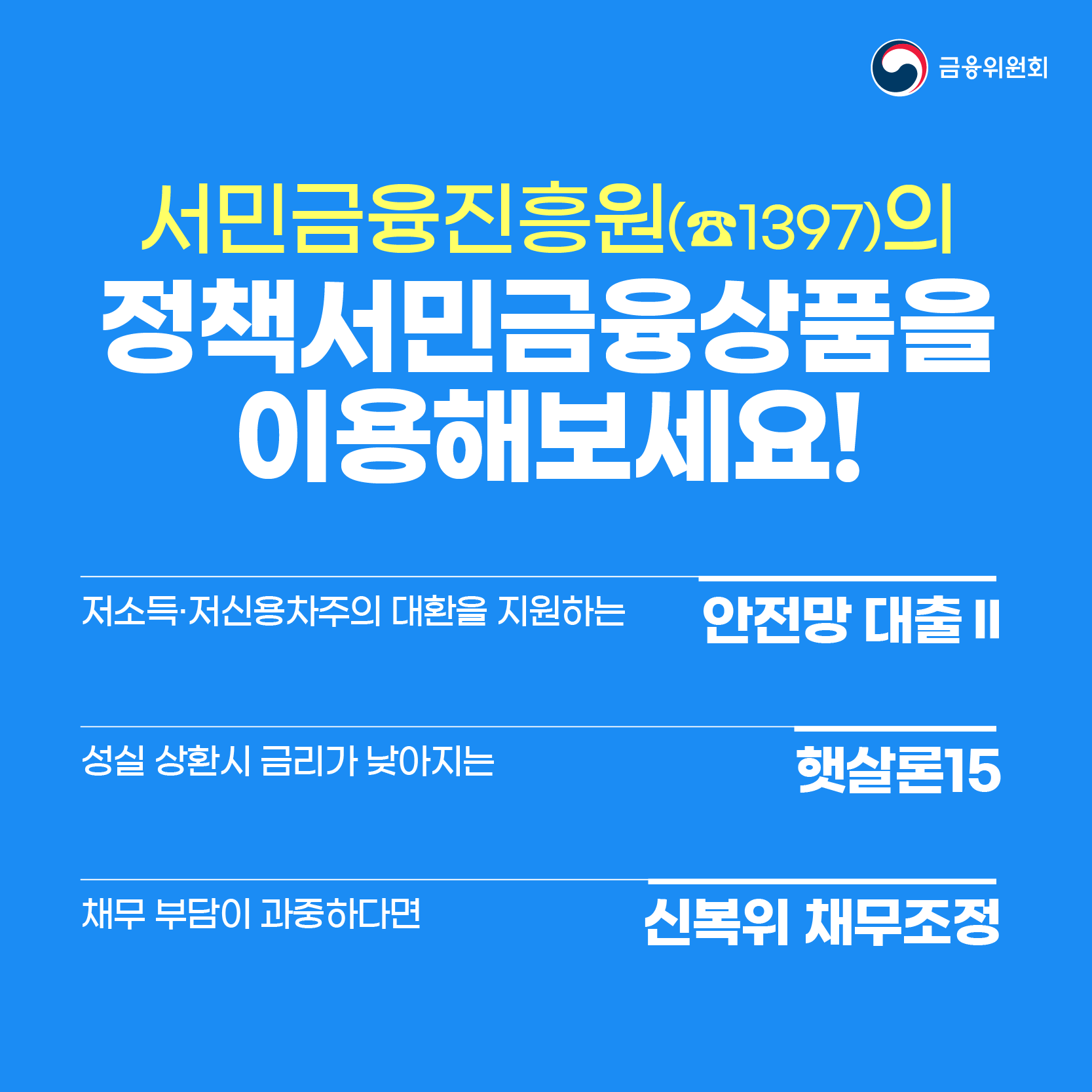 안전망 대출Ⅱ, 햇살론15 등 정책상품 이용을 문의(서민금융진흥원 1397)해보세요.