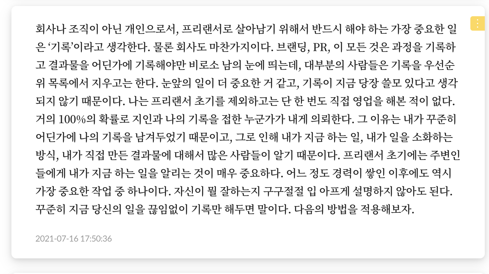책<프리랜서가 온다>에서 발췌했다. 기록의 중요성을 강조한 글이다. 개인 블로그를 운영한지 10년 정도가 되어간다. 처음엔 공을 들여 쓴 글들도 많았지만 요즈음은 독서노트나 궁금했던 것을 찾아 정리하는 글을 쓴다. 글을 쓴다기보다 메모에 더 가깝다. 이 기록들이 나중에 어떤 나비효과를 이룰지 모르겠다. 나의 젊은 시절부터 생각과 일상들이 기록되어 있다는 점에서 개인블로그는 내게 소중한 보물이다.
