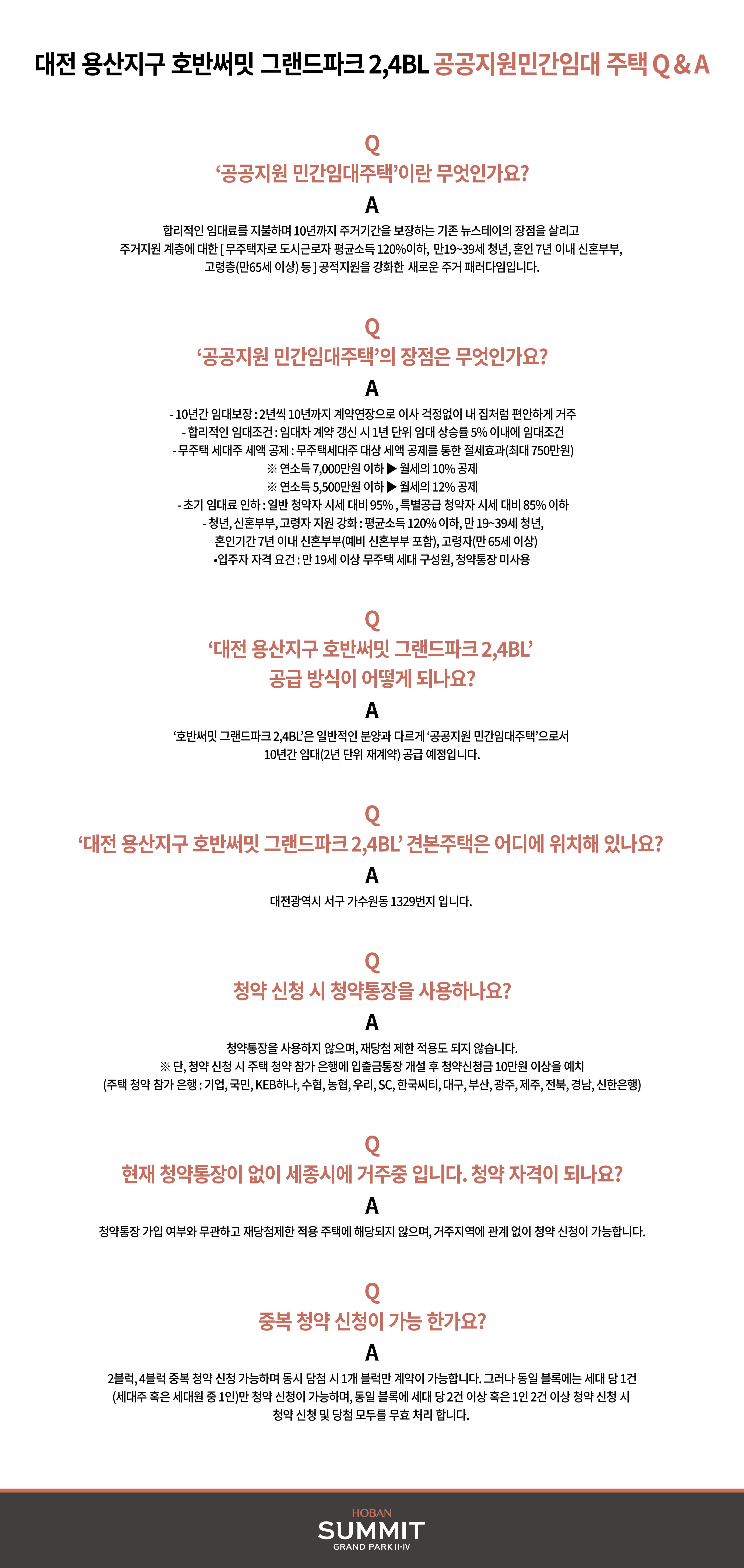 대전 용산지구 호반써밋 그랜드파크 2,4BL 공공지원민간임대 주택 Q&A 파일을 공유합니다. 청약통장 없이 신청할 수 있는 아파트라 관심이 많으리라 예상됩니다.