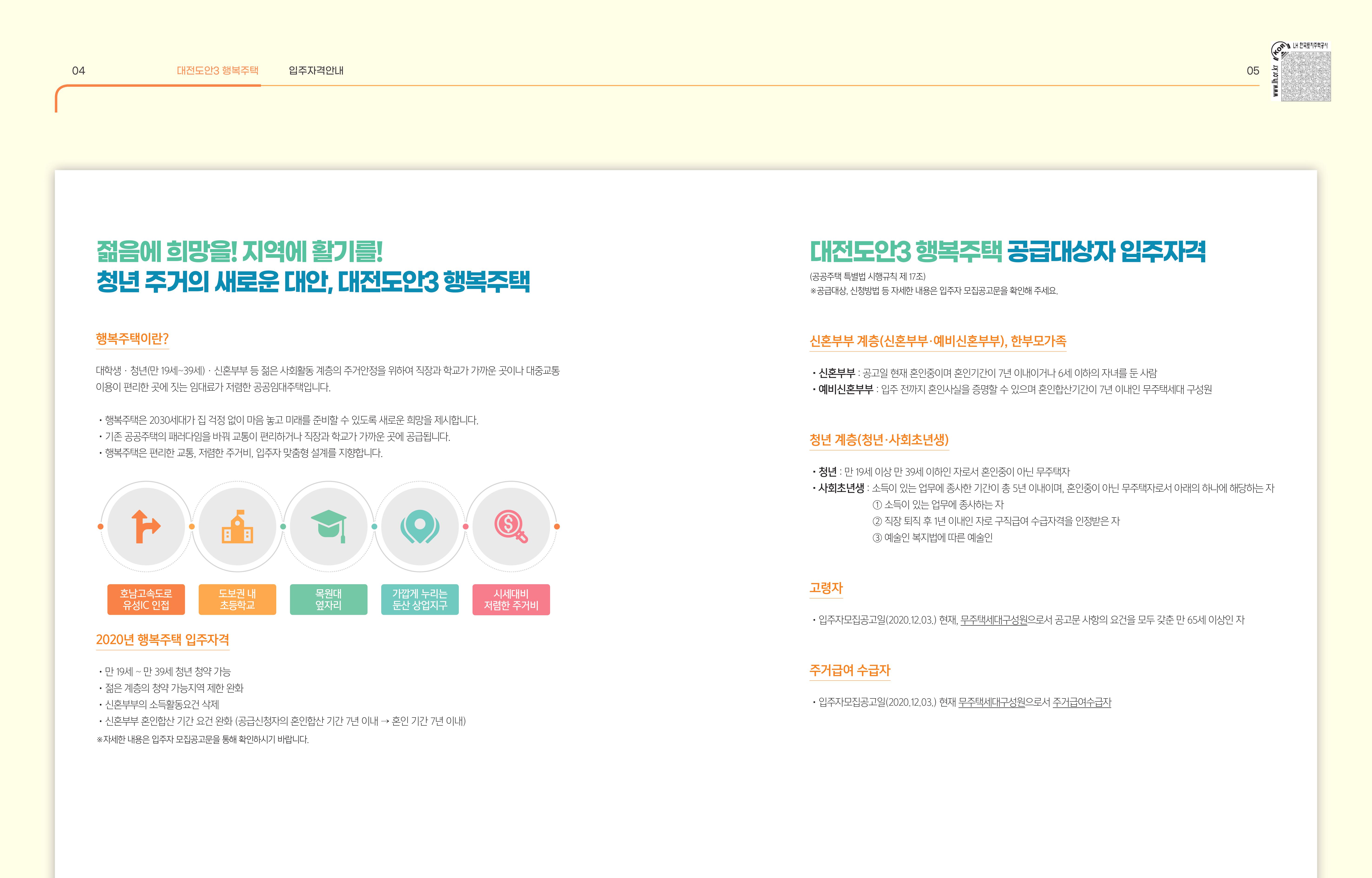 | 도안3H1 행복주택은 입주자모집공고일(2021.07.20) 현재 다음 중 하나에 해당하는 사람에게 공급됩니다. ※ 신청자격별 세부 자격요건은 공고문 본문(3. 신청자격)을 확인하시기 바랍니다. ① 청년 계층 - 청년 : 만19세 이상 만39세 이하인 자 - 사회초년생 : 소득이 있는 업무에 종사한 기간이 총 5년 이내이며, 아래의 하나에 해당하는 자 1) 소득이 있는 업무에 종사하는 자 2) 퇴직한 후 1년이 지나지 않은 사람으로서 구직급여 수급자격을 인정받은 자 3) 예술인 ② 신혼부부·한부모가족 계층 - 신혼부부 : 공고일 현재 혼인중이며 혼인기간이 7년 이내이거나 6세 이하의 자녀를 둔 사람 - 예비신혼부부 : 입주 전까지 혼인사실을 증명할 수 있는 자 - 한부모가족 : 만6세이하 자녀를 둔 한부모인 자 ③ 고령자 : 만 65세 이상의 사람 ④ 주거급여수급자 : 「주거급여법」제2조제2호 및 제3호에 따른 수급권자 또는 수급자 |