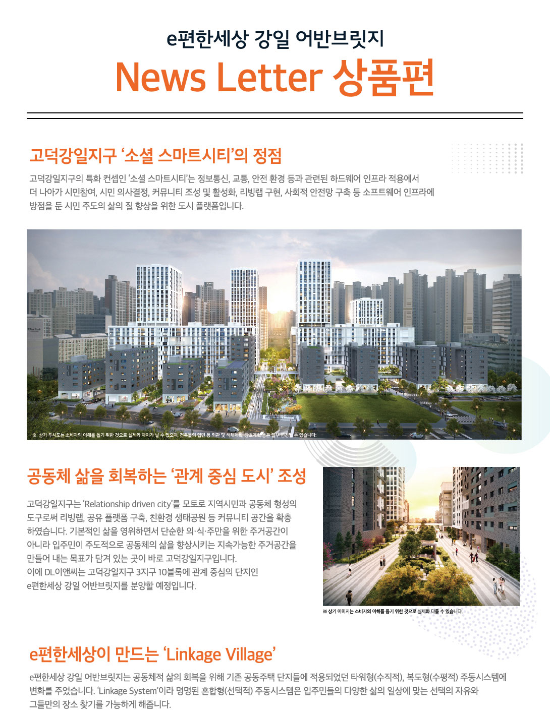 고덕 강일지구는 소셜 스마트시티를 컨셉으로 하는 아파트단지입니다. 정보통신과 교통, 안전 환경 등과 관련된 하드웨어 인프라 적용에서 더 나아가 시민참여, 커뮤니티 조성 및 활성화, 사회적 안전망 구축 등 소프트웨어 인프라에 방점을 뒀습니다.