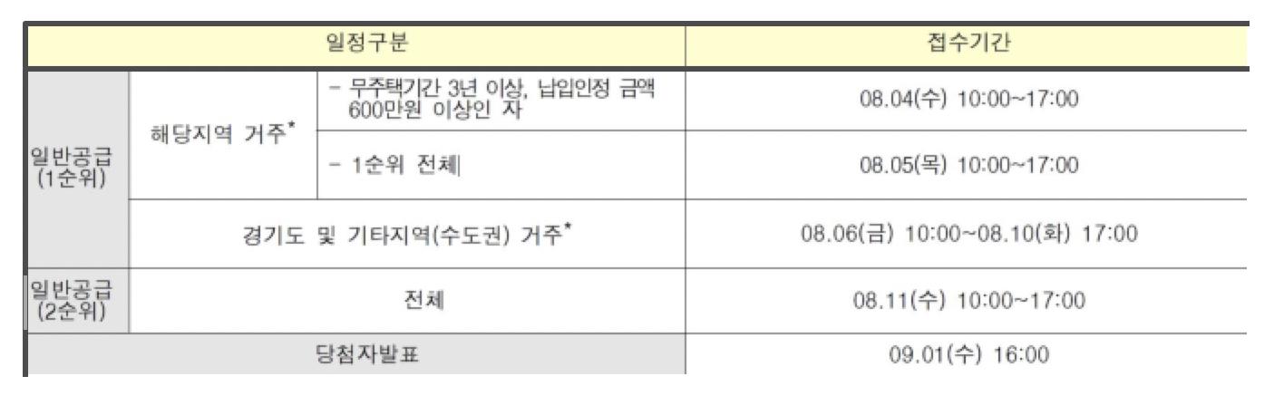 ㅇ 해당지역에 거주하고 있으나, 무주택기간과 납입인정 금액 요건을 갖추지 못한 1순위는 8월 5일(목)에 신청하면 된다. 경기도 및 수도권 거주하는 1순위는 8월 6일(금)부터 10일(화)까지, 일반공급 2순위는 8월 11일(수)에 신청할 수 있다.