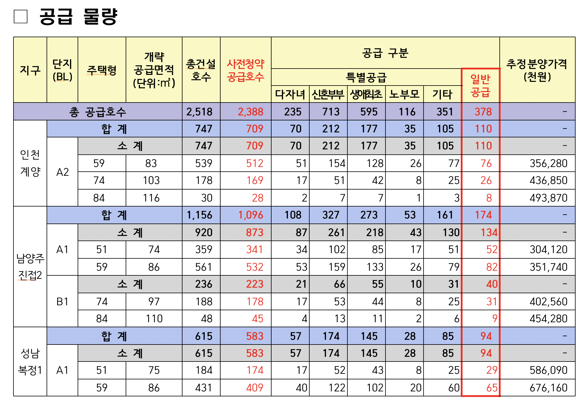 공공분양 일반공급 물량은 총 378호로 인천계양에서 110호, 남양주진접2에서 174호, 성남복정1에서 94호가 공급된다.
