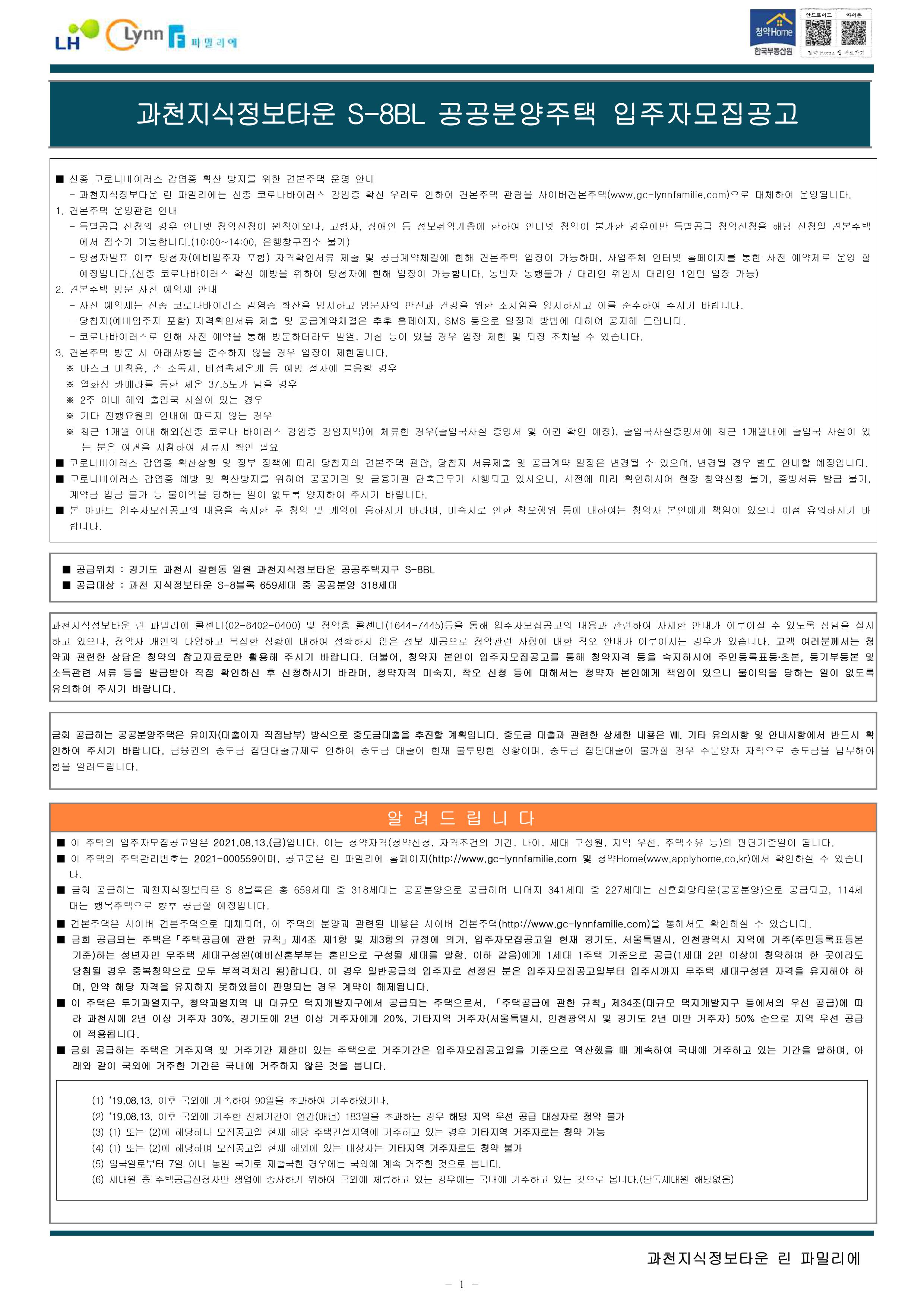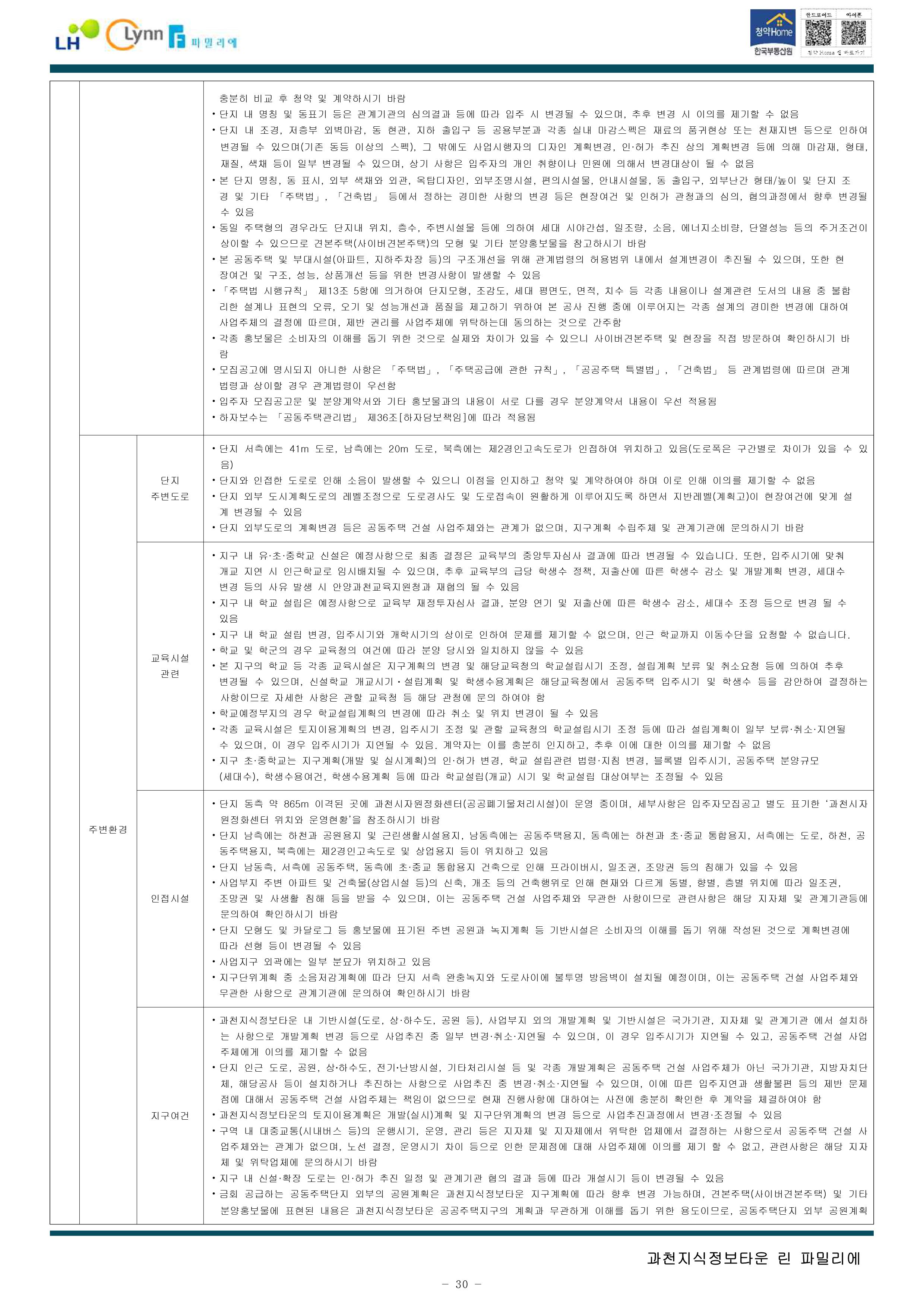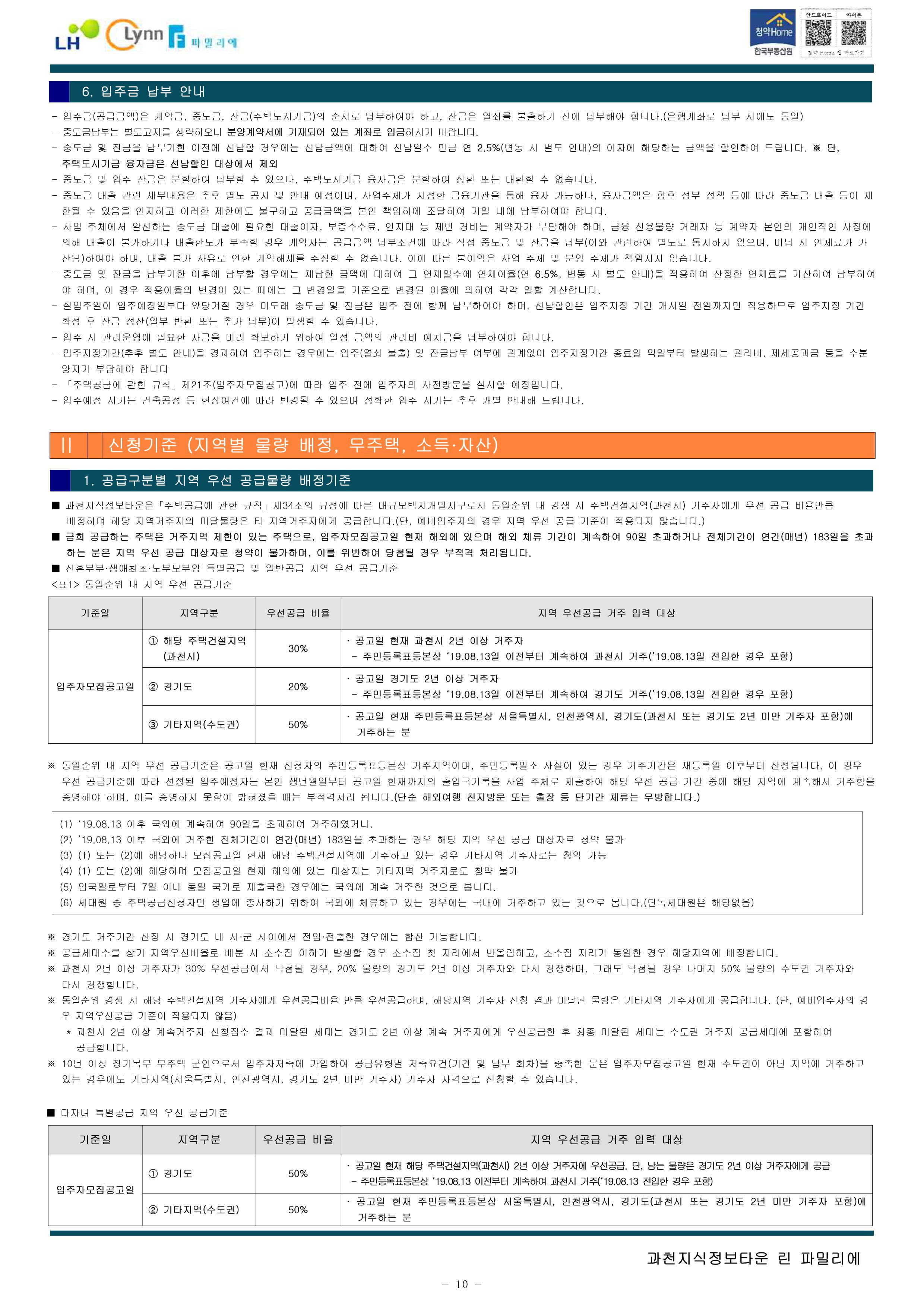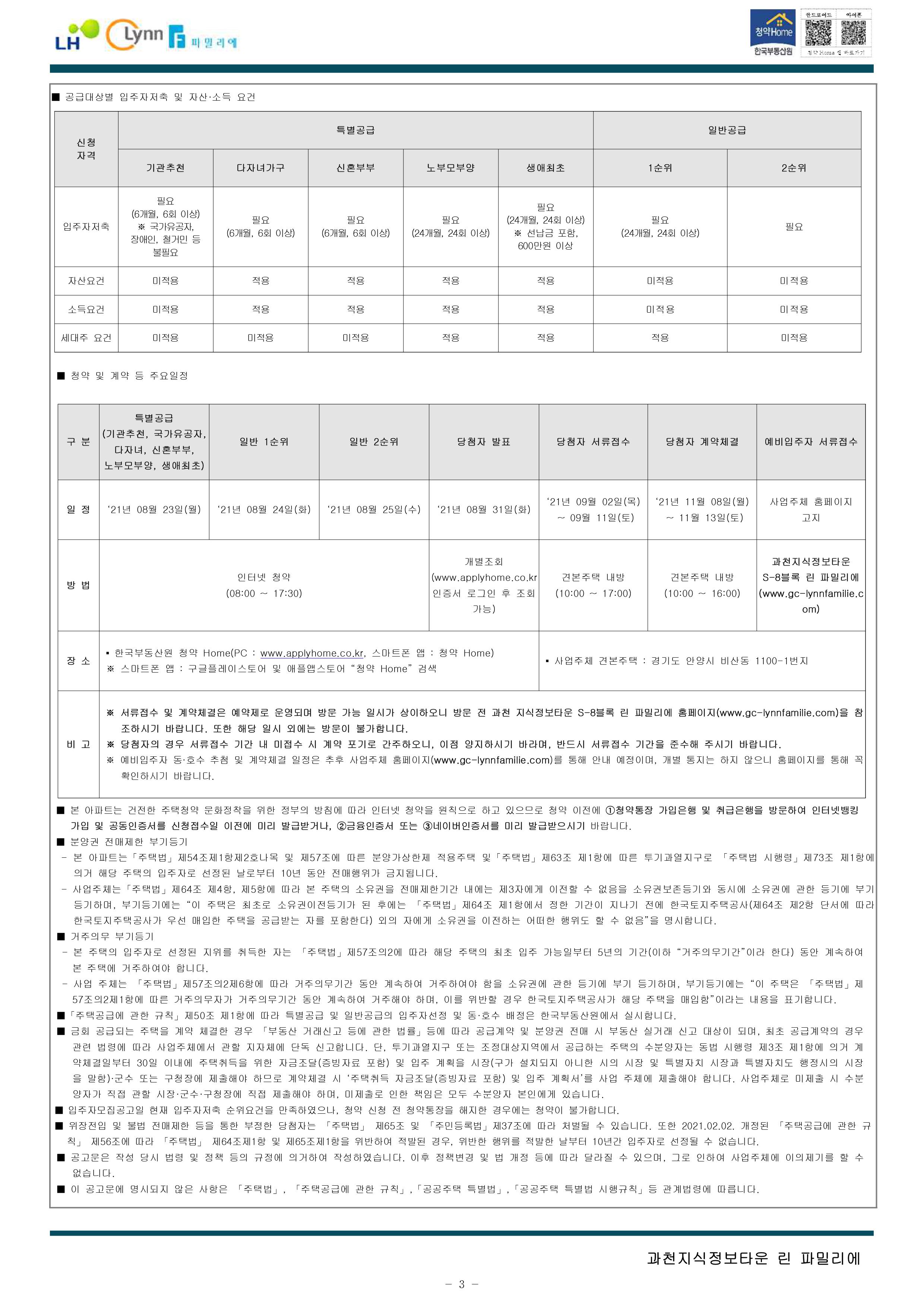 과천지식정보타운 린파밀리에 공옹분양주택 입주자 모집 공고문입니다.