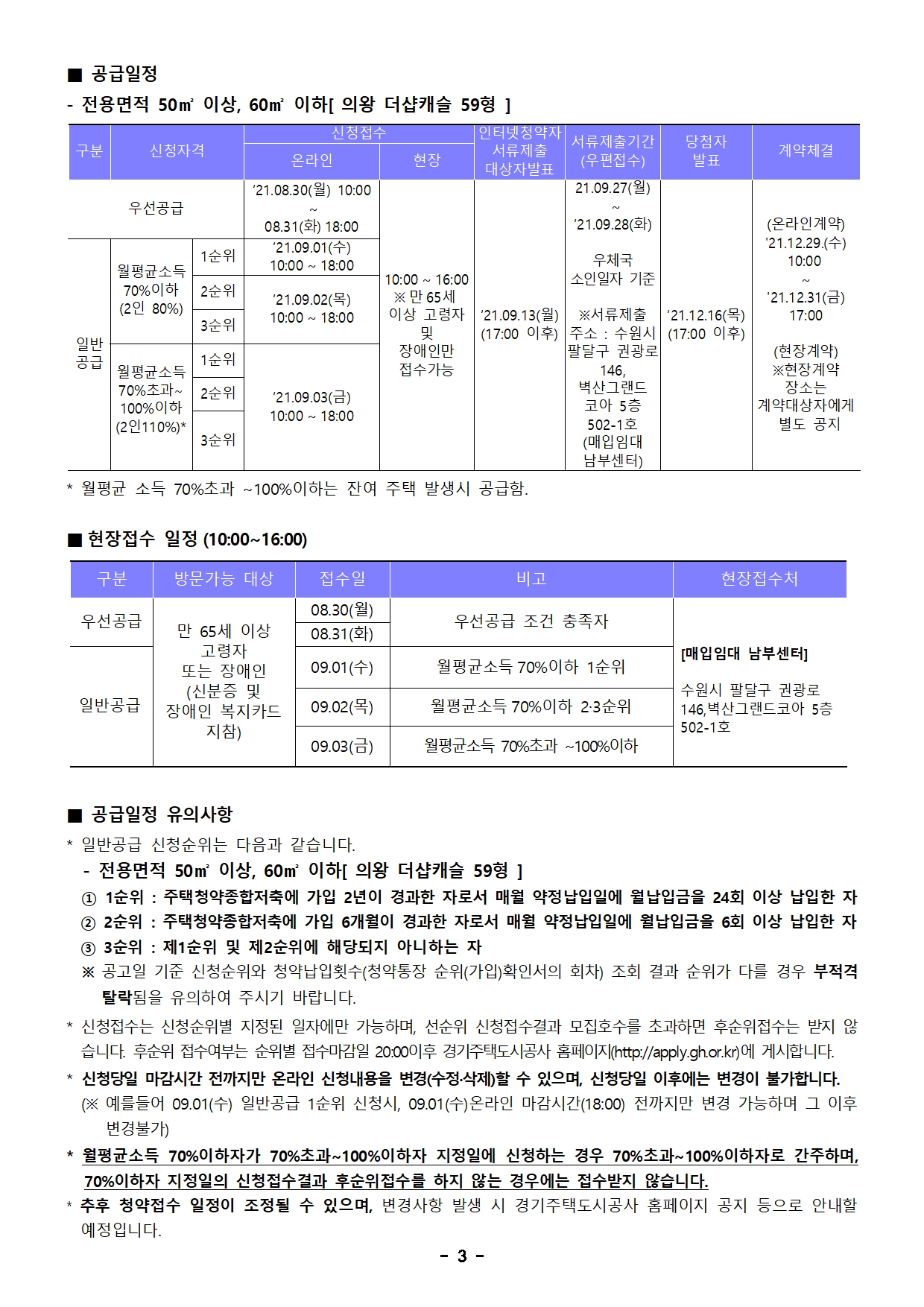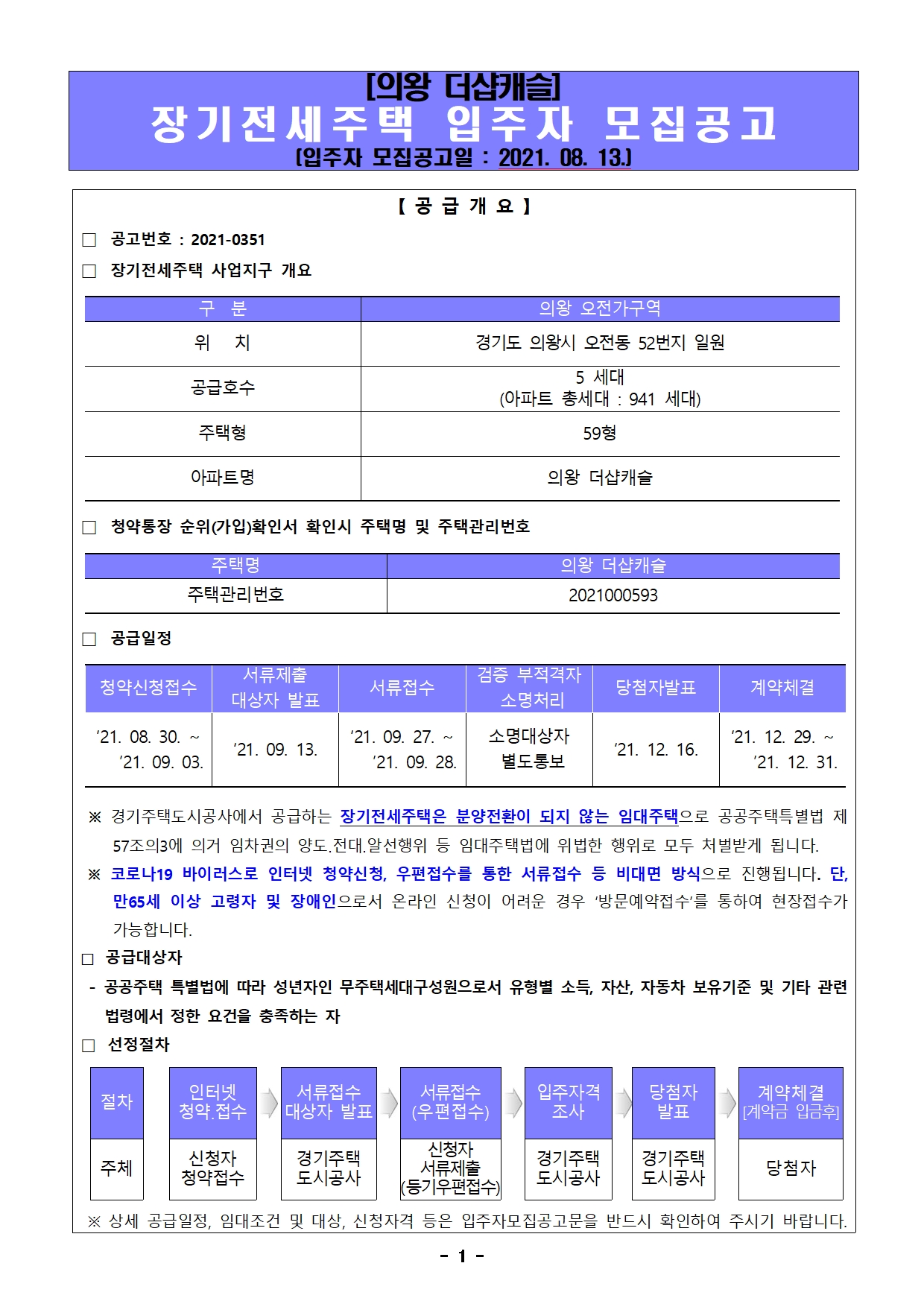 ※ 코로나19 바이러스로 인터넷 청약신청, 우편접수를 통한 서류접수 등 비대면 방식으로 진행됩니다. 단, 만65세 이상 고령자 및 장애인으로서 온라인 신청이 어려운 경우 ‘방문예약접수’를 통하여 현장접수가 가능합니다.