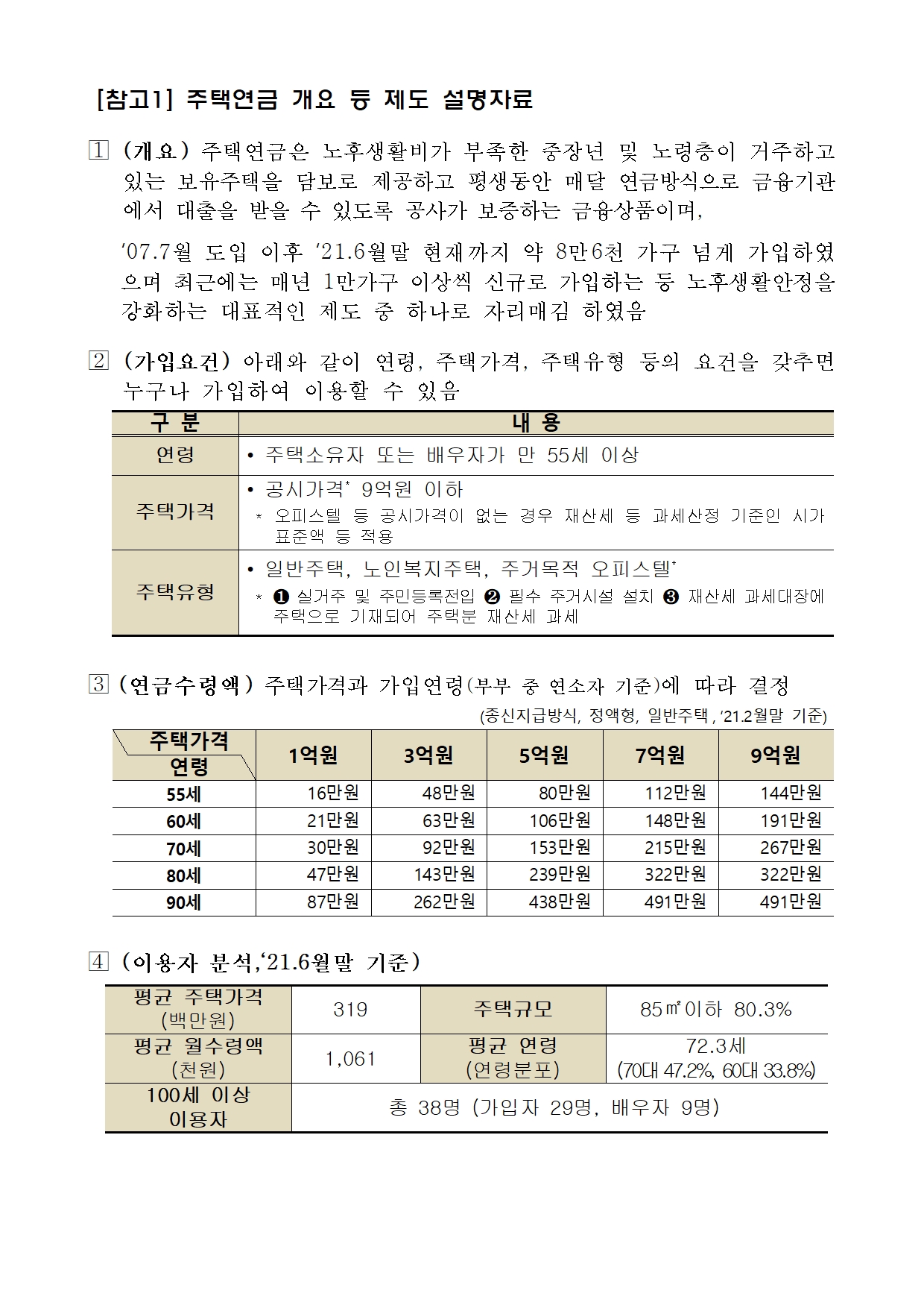 ◈ 주택연금이란? 주택연금은 내 집을 담보로 제공하고 금융기관 대출을 통해 매달 일정금액을 평생 동안 연금처럼 수령할 수 있도록 국가가 보증하는 금융상품이다. ◈ 주택연금 수령방식이란? 가입 시 결정된 총연금액(연금대출한도)을 평생 동일하게 나누어 받을지, 가입초기에 많이 받을 지, 가입 후반에 많이 받을지 등을 선택하는 연금수령 방식을 말한다. 가입자별 연금대출한도는 지급유형과 관계없이 동일하므로 가입초기에 많이 받으면 나중에는 그 금액만큼 줄어든다는 점은 미리 알고 선택해야 한다. |