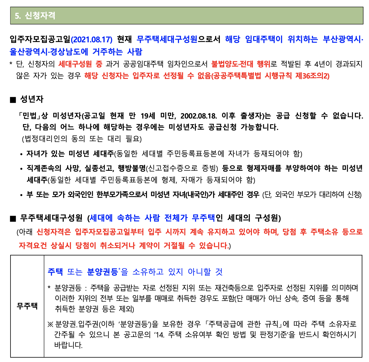 ▪ 금회 모집 단지는 부산광역시·울산광역시·경상남도에 거주하는 무주택 세대구성원 요건만을 입주자격으로 합니다.