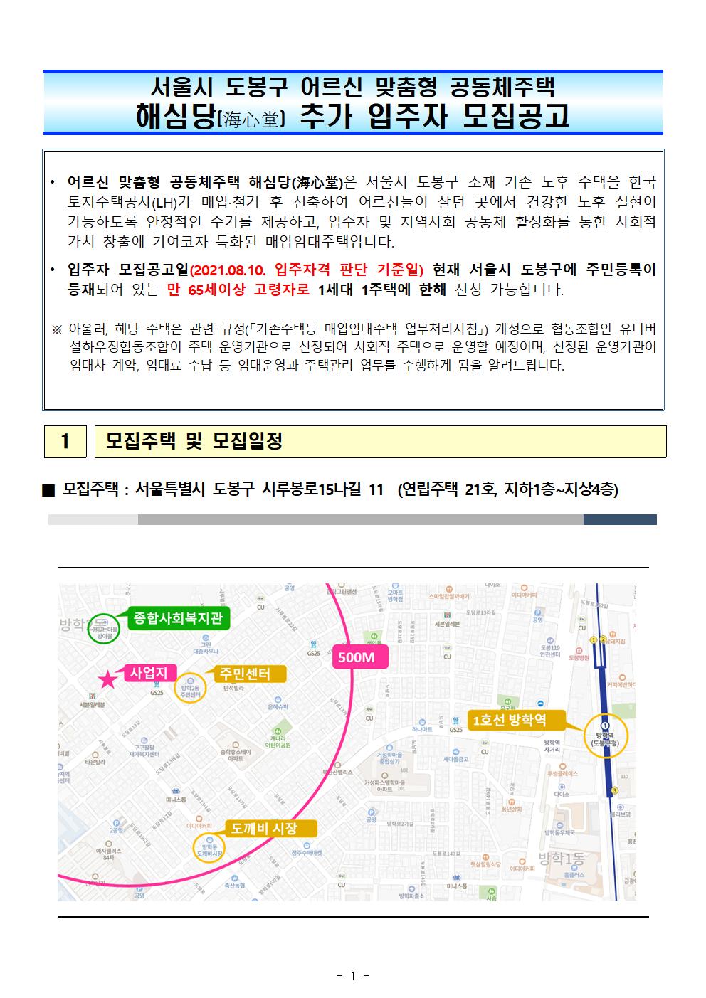 | 어르신 맞춤형 공동체주택 해심당(海心堂)은 서울시 도봉구 소재 기존 노후 주택을 한국 토지주택공사(LH)가 매입·철거 후 신축하여 어르신들이 살던 곳에서 건강한 노후 실현이 가능하도록 안정적인 주거를 제공하고, 입주자 및 지역사회 공동체 활성화를 통한 사회적 가치 창출에 기여코자 특화된 매입임대주택입니다. ⦁ 입주자 모집공고일(2021.08.10. 입주자격 판단 기준일) 현재 서울시 도봉구에 주민등록이 등재되어 있는 만 65세이상 고령자로 1세대 1주택에 한해 신청 가능합니다. ※ 아울러, 해당 주택은 관련 규정(「기존주택등 매입임대주택 업무처리지침」) 개정으로 협동조합인 유니버 설하우징협동조합이 주택 운영기관으로 선정되어 사회적 주택으로 운영할 예정이며, 선정된 운영기관이 임대차 계약, 임대료 수납 등 임대운영과 주택관리 업무를 수행하게 됨을 알려드립니다. |