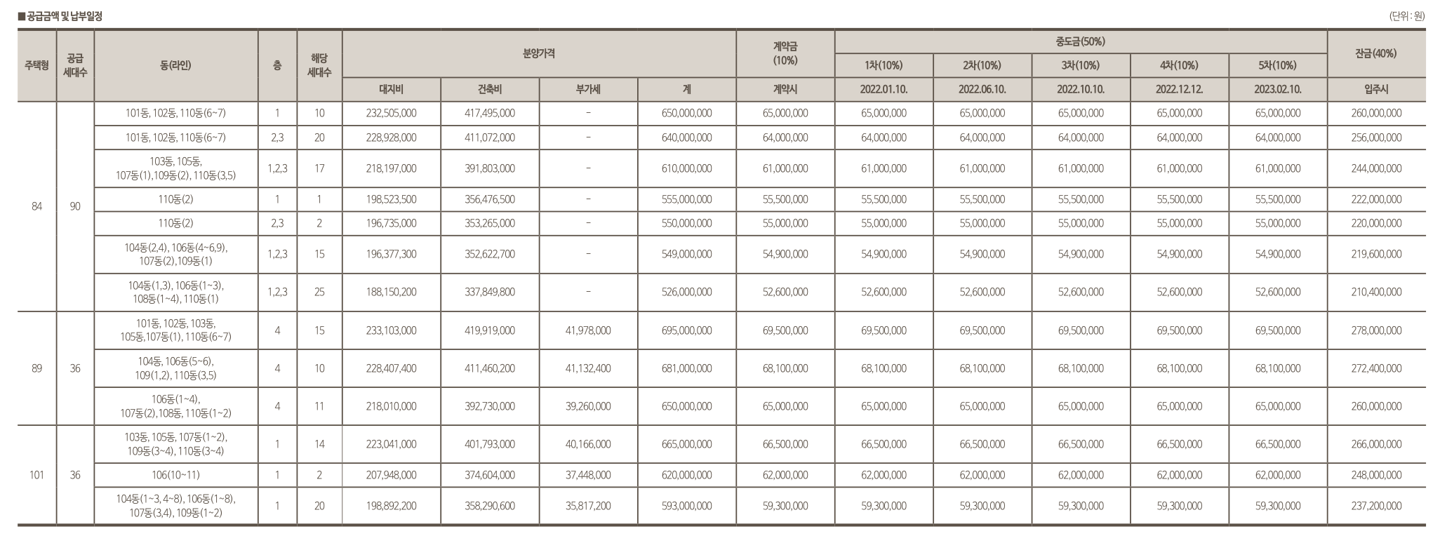 공급금액 및 납부일정