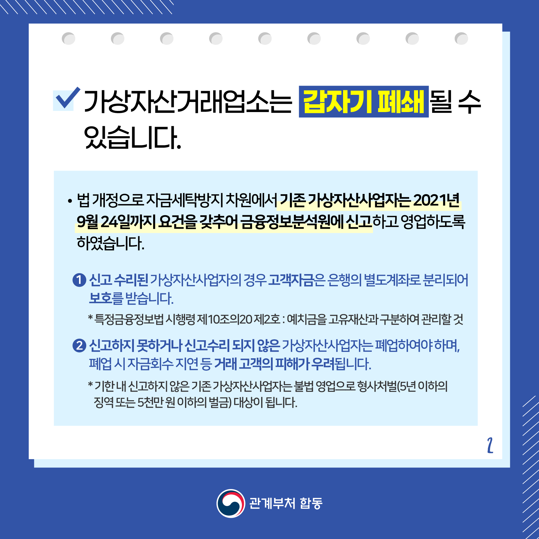 ㅇ 일부 기존 사업자의 경우 신고하지 않고 폐업할 가능성이 있으므로, 고객들은 이와 관련된 피해를 입지 않도록 기존 사업자의 신고 상황, 사업 지속여부 등을 최대한 확인하고 가상자산거래를 하시기 바랍니다.
