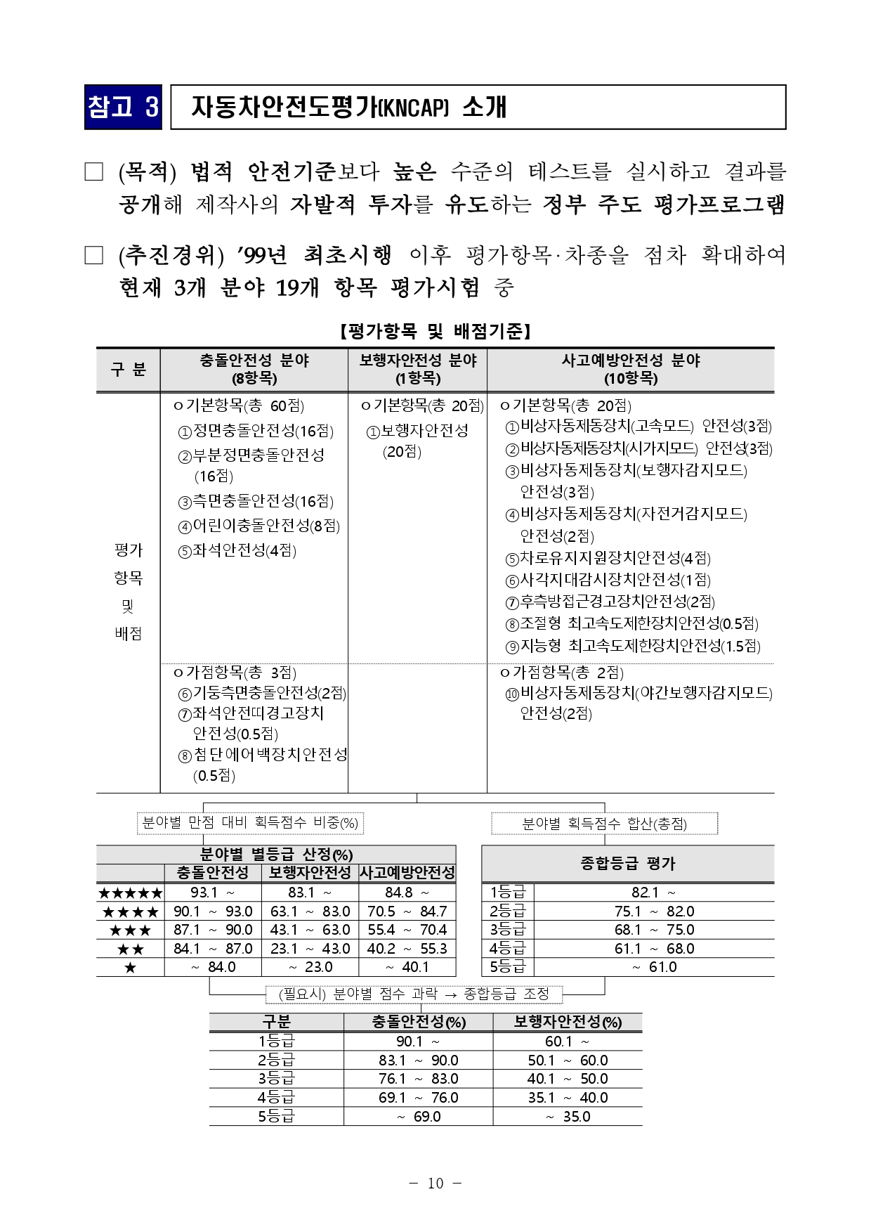 * (KNCAP, Korea New Car Assessment Program) 자동차 충돌기준 등 법적기준보다 높은 수준의 테스트를 실시하고 결과를 공개하여 제작차량의 안전도 향상을 유도하는 정부 주도 평가프로그램(EURO NCAP, US NCAP 등 주요국 모두 실시 중)