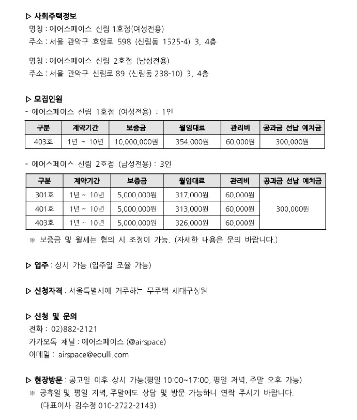 에어스페이스 신림 1호점과 신림2호점은 어울리의 첫 번째 서울시 리모 델링형 사회주택이며, 셰어하우스로 운영됩니다. 에어스페 이스에서 따로 또 함께 살아가며 미래를 만들어갈 청년을 모집합니다.