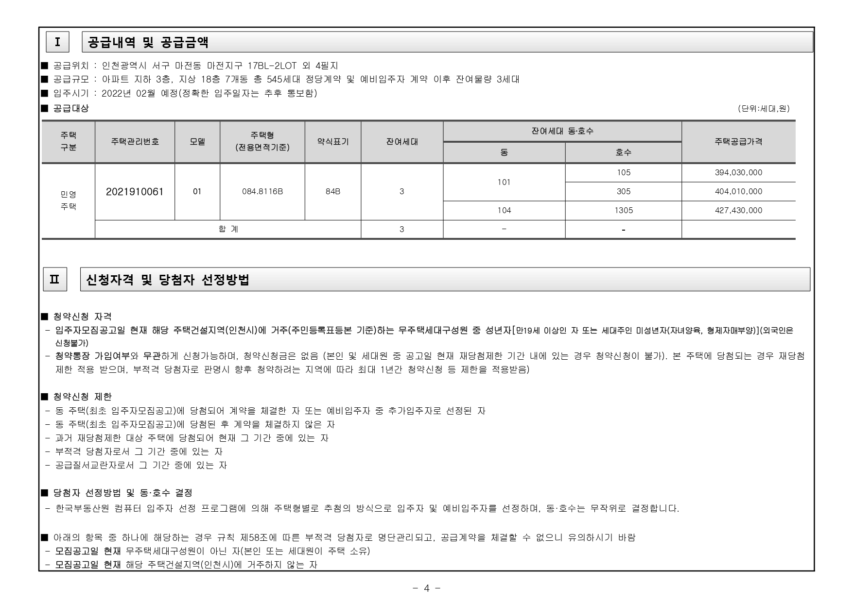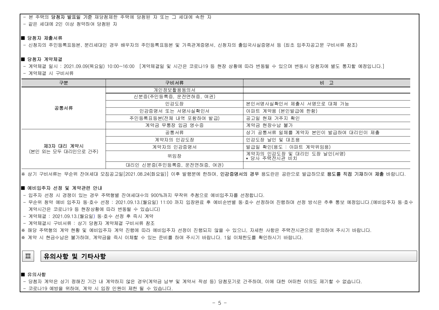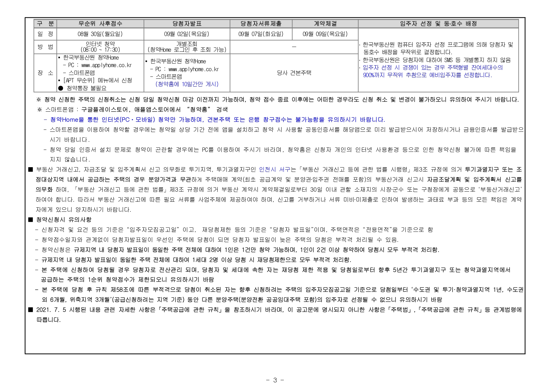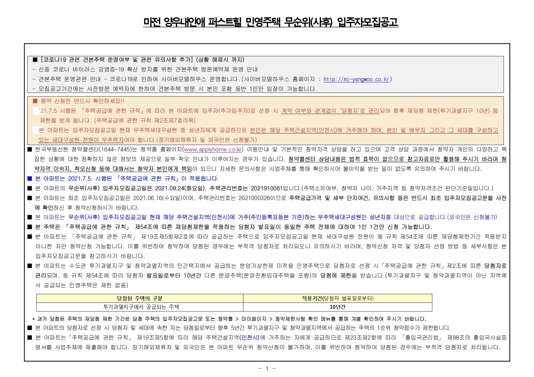 ★ ‘21.7.5 시행된 「주택공급에 관한 규칙」에 따라 본 아파트에 입주자(추가입주자)로 선정 시 계약 여부와 관계없이 ‘당첨자’로 관리되어 향후 재당첨 제한(투기과열지구 10년) 등 제한을 받게 됩니다. (주택공급에 관한 규칙 제2조제7호라목)