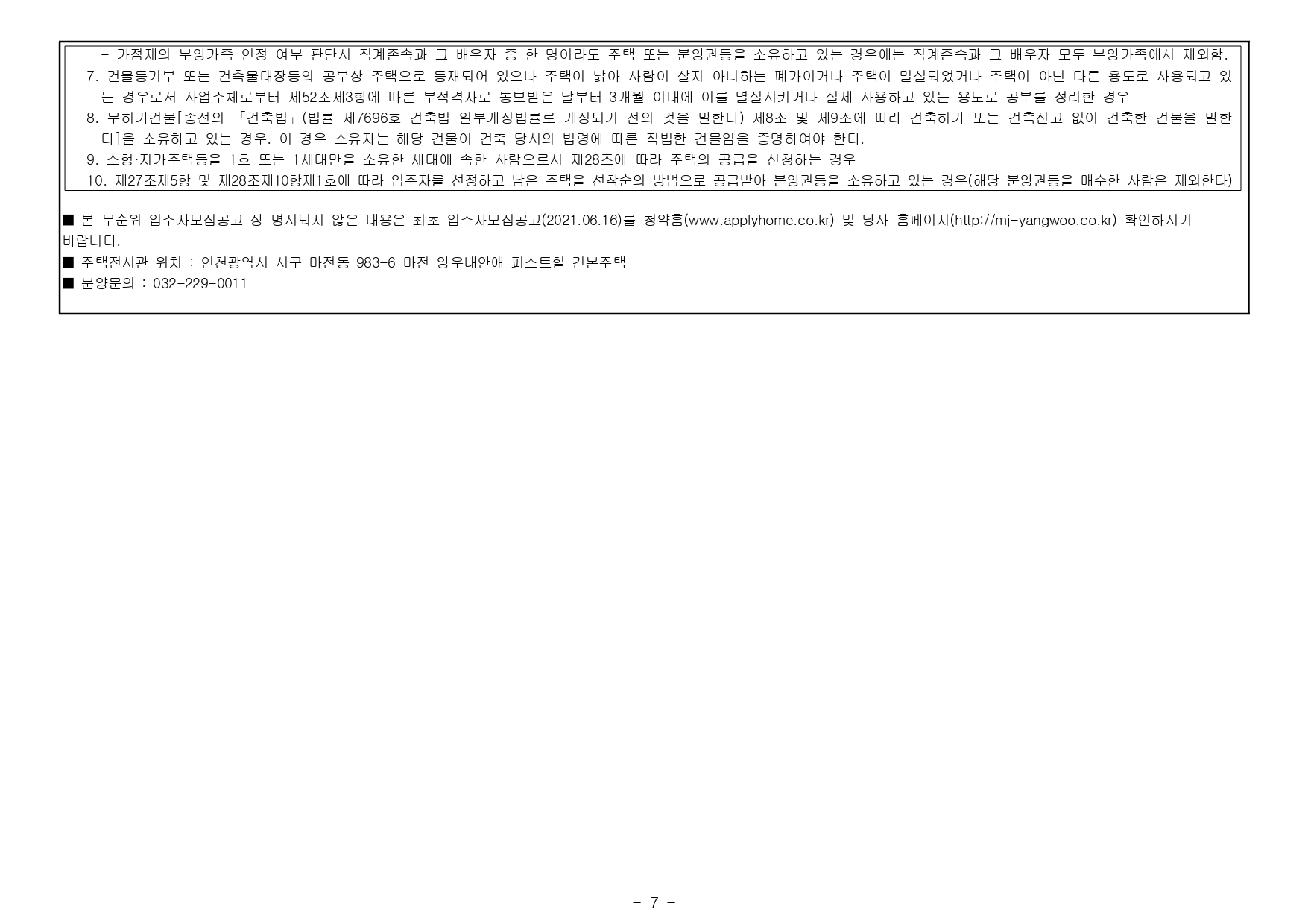 ★ ‘21.7.5 시행된 「주택공급에 관한 규칙」에 따라 본 아파트에 입주자(추가입주자)로 선정 시 계약 여부와 관계없이 ‘당첨자’로 관리되어 향후 재당첨 제한(투기과열지구 10년) 등 제한을 받게 됩니다. (주택공급에 관한 규칙 제2조제7호라목)