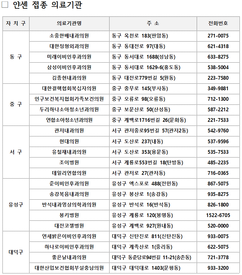 ○ 예약방법 : 거주지 보건소 전화예약(대전 120콜센터, 의료기관 전화예약 불가)