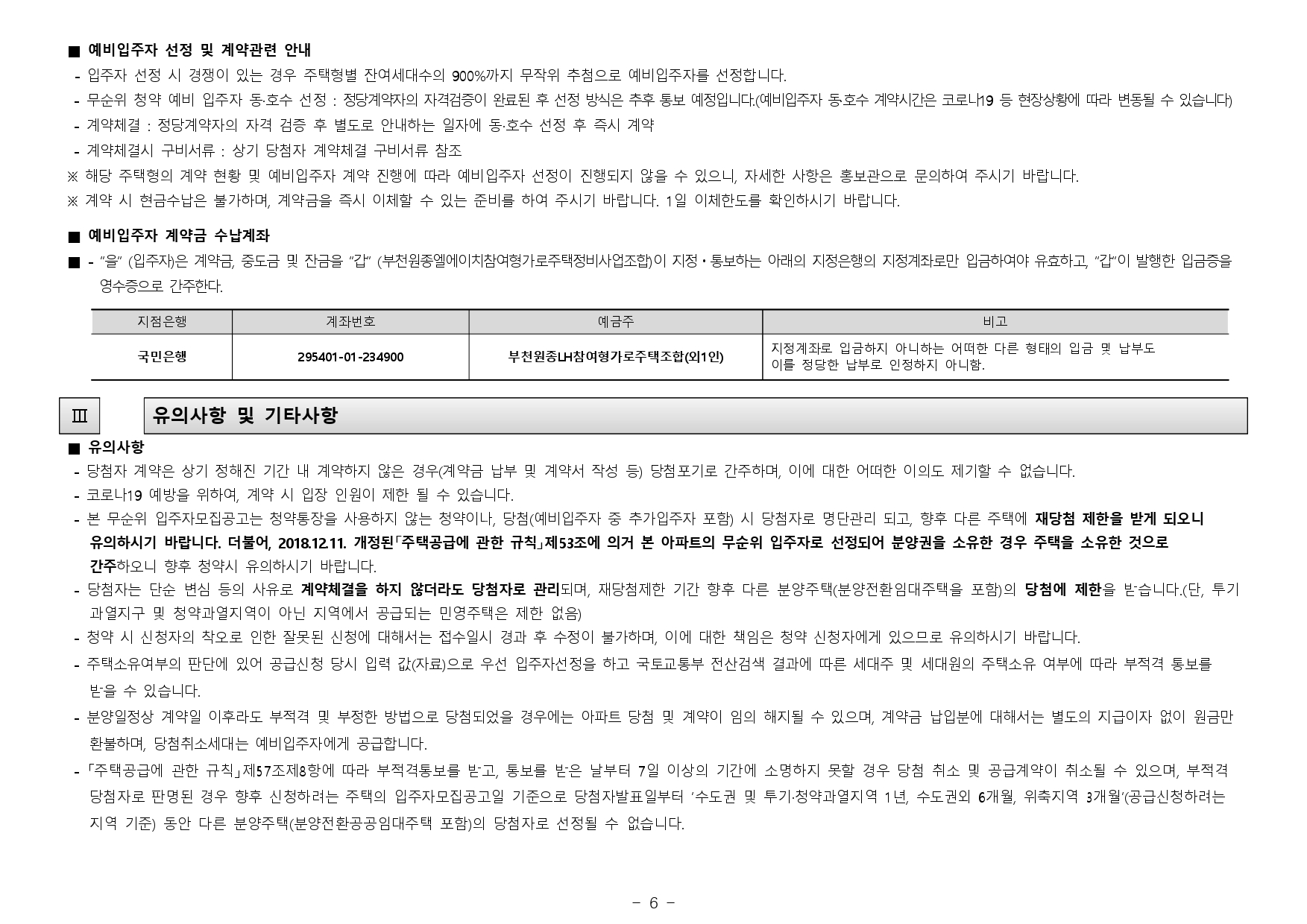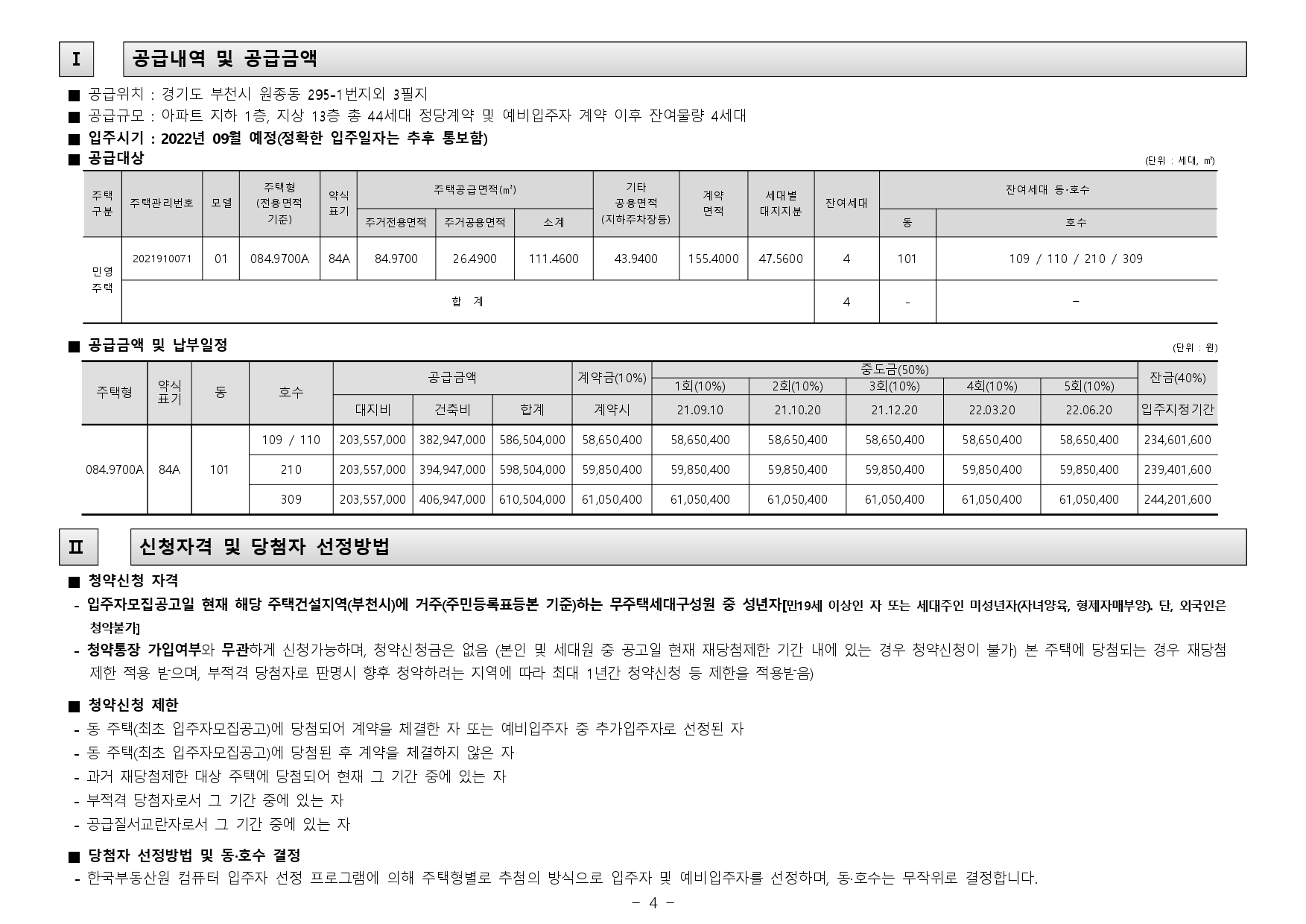 - 한국부동산원 컴퓨터 입주자 선정 프로그램에 의해 주택형별로 추첨의 방식으로 입주자 및 예비입주자를 선정하며, 동·호수는 무작위로 결정합니다