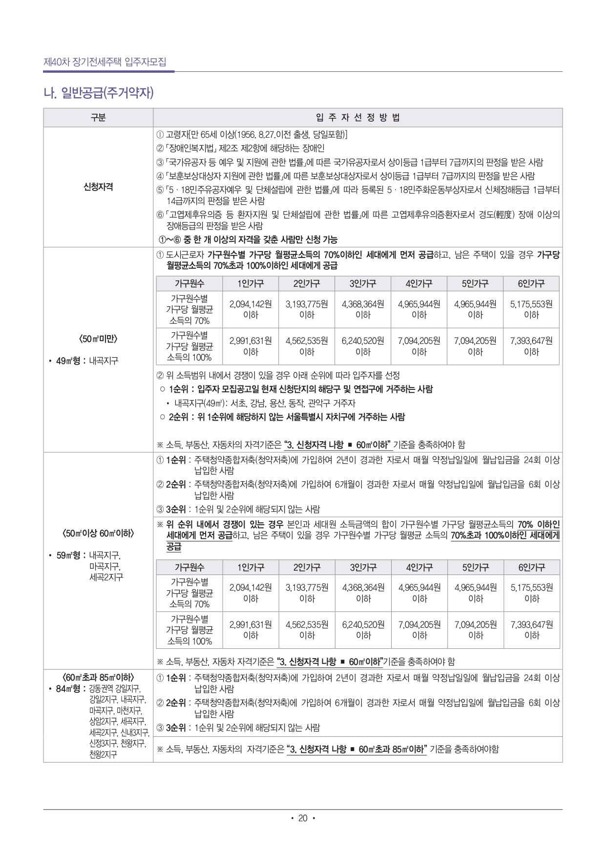 - 단, 「장애인고용촉진 및 직업재활법」에 따른 중증장애인 확인서가 발급 가능한 사람은(「장애인고용촉진 및 직업재활법 시행규칙」 별표1에 따른 중증장애인)은 단독세대주라도 50㎡미만의 주택을 신청할 수 있음