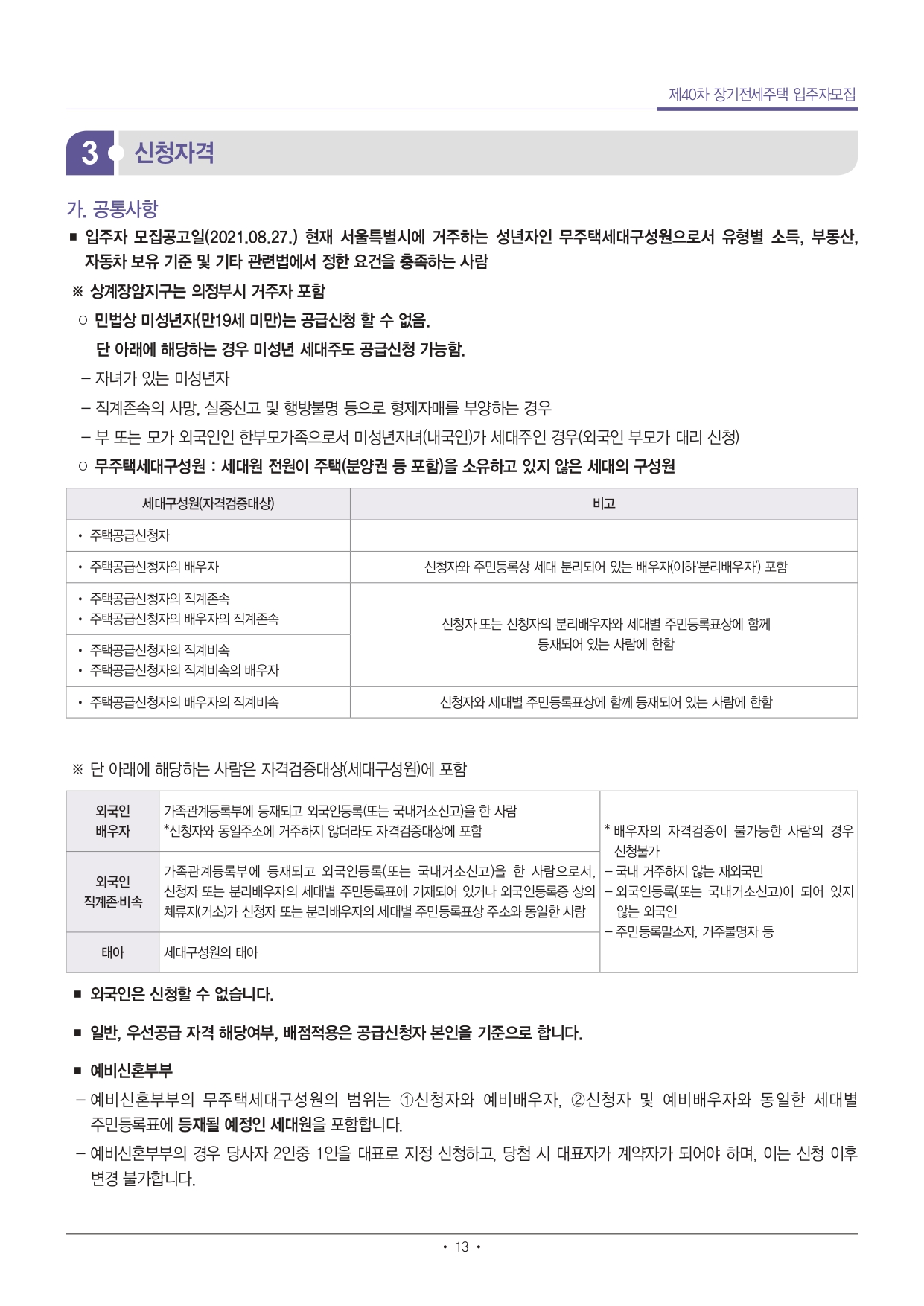 ■ 입주자격 중 주택소유, 소득, 부동산, 자동차 자격기준 산정시점은 입주자 모집공고일로 하되, 사업주체가 입주대상자 확정을 목적으로 사회보장정보시스템을 통해 확인한 입주자격은 입주자 모집공고일에 산정된 것으로 간주합니다. 입주자격 조사결과 부적격사유에 대한 소명의무는 신청자에게 있습니다.