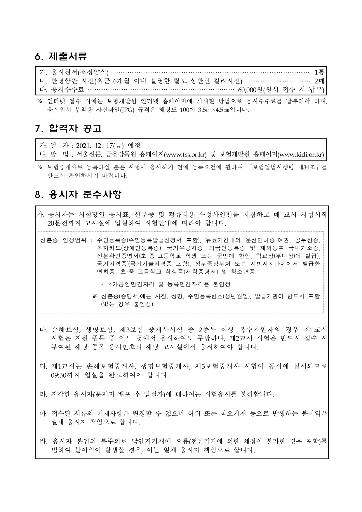 □ 방문접수 시간은 접수기간 중 09:30~18:00이며, 우편접수(등기)는 제출서류가 보험 개발원에 응시원서 접수마감일(접수마감일 이후에도 접수마감일까지 소인이 찍힌 우편은 접수 가능)까지 도착되고, 응시표를 송부하기 위한 반송용 주소가 기재된 규격봉투 (등기우표 부착)와 응시수수료에 해당되는 통상환증서가 동봉된 것에 한합니다.