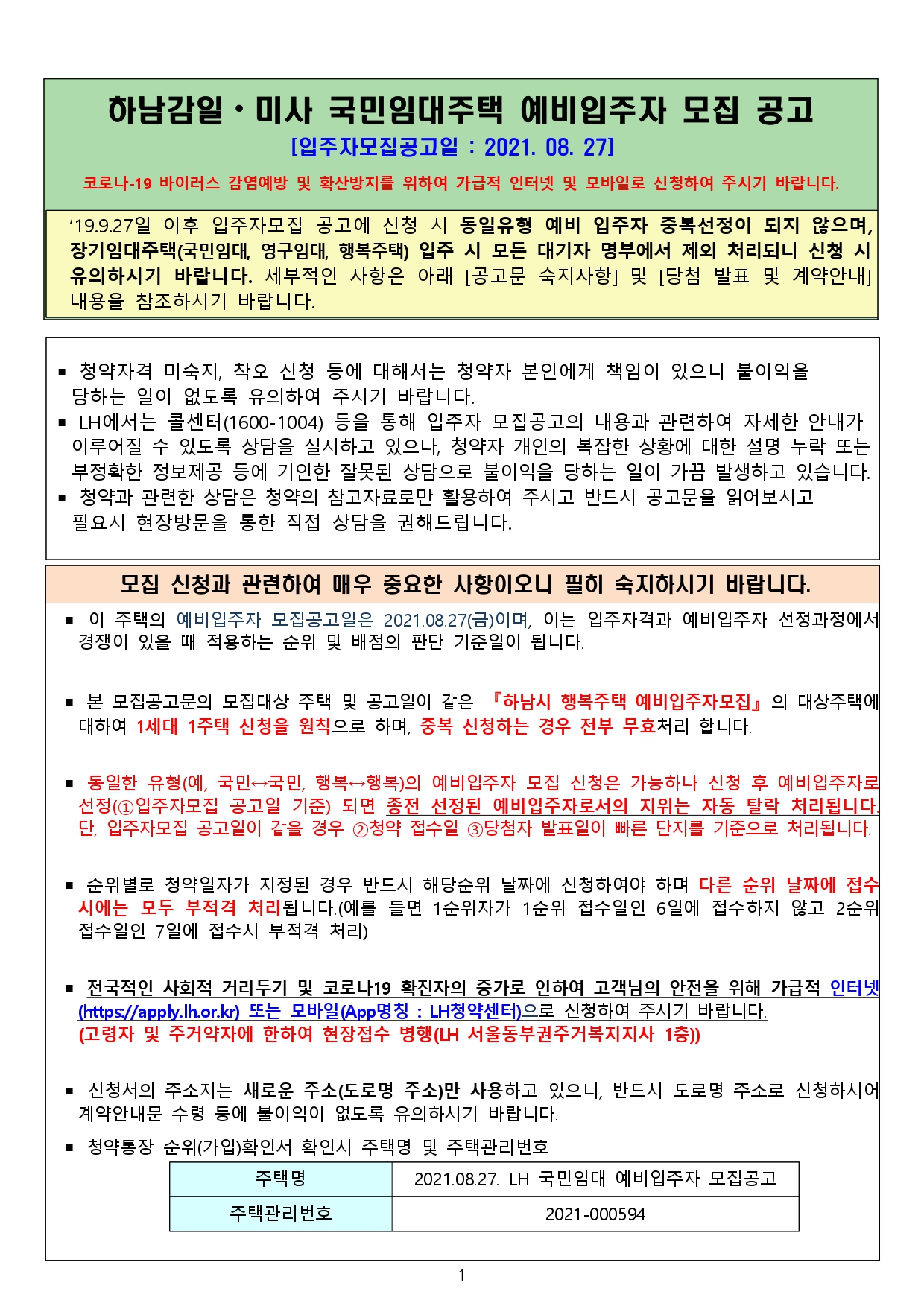 하남감일·미사 국민임대주택 예비입주자 모집 공고(8.27)입니다. 아래 내용을 참고하세요.