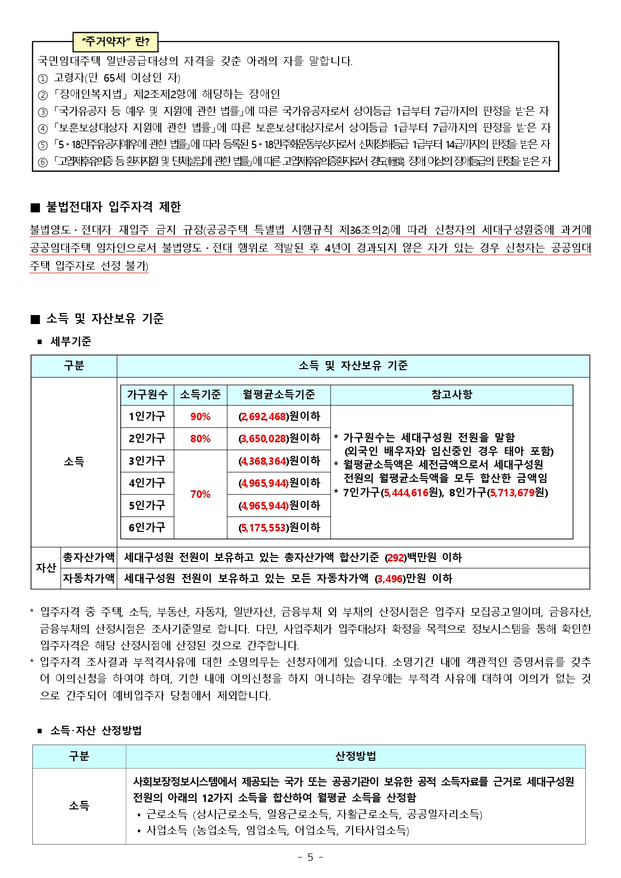 국민임대주택 신청자는 무주택세대구성원으로서 소득, 자산 등의 자격요건을 충족하여야 합니다. 신청자와 해당 세대구성원 전원은 국토교통부 주택소유확인시스템을 통하여 주택소유 여부, 보건복지부 사회보장정보시스템을 통하여 소득과 자산기준 초과여부, 전산관리지정기관을 통하여 불법전대자 재입주 금지기간 위반 여부를 검증한 후 자격 충족시 입주자로 선정됩니다.