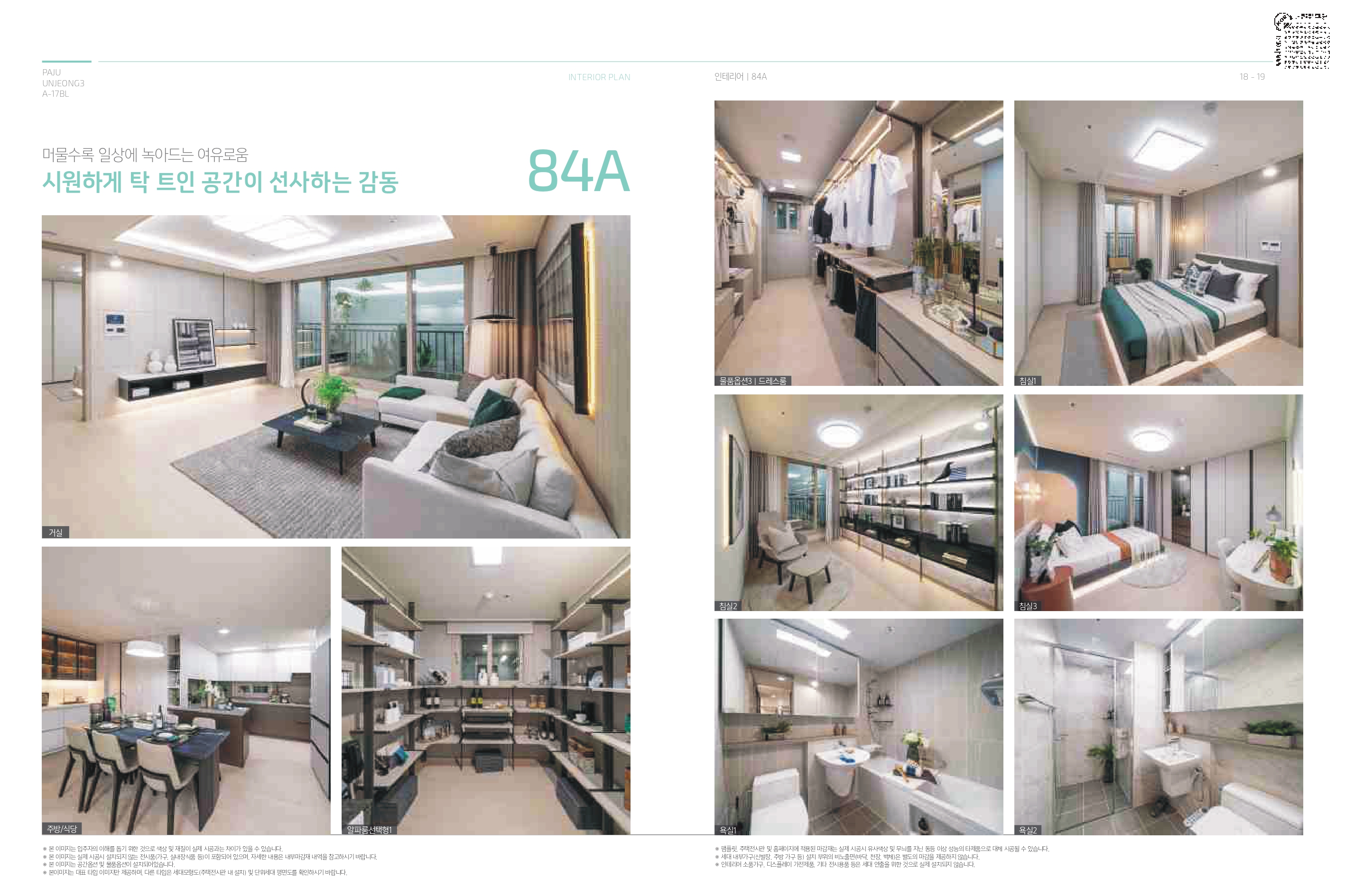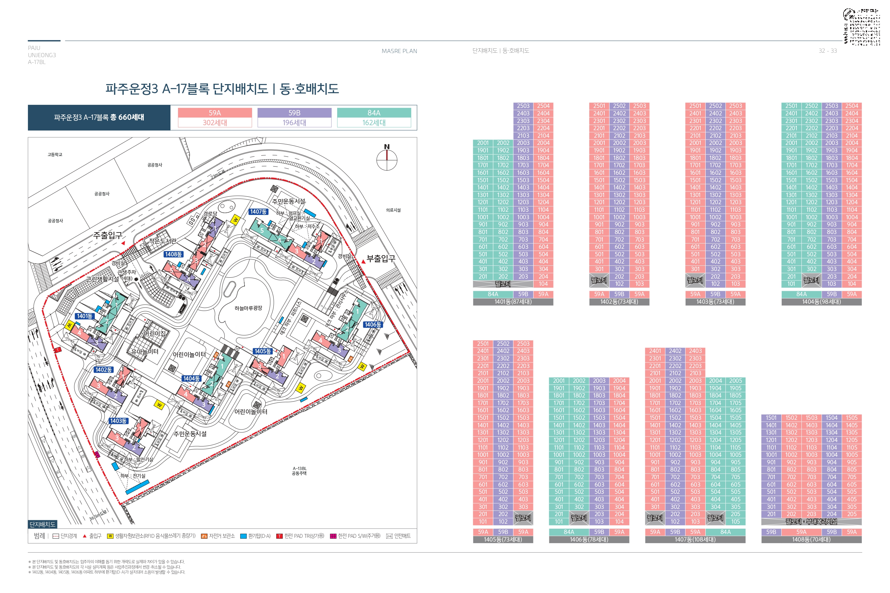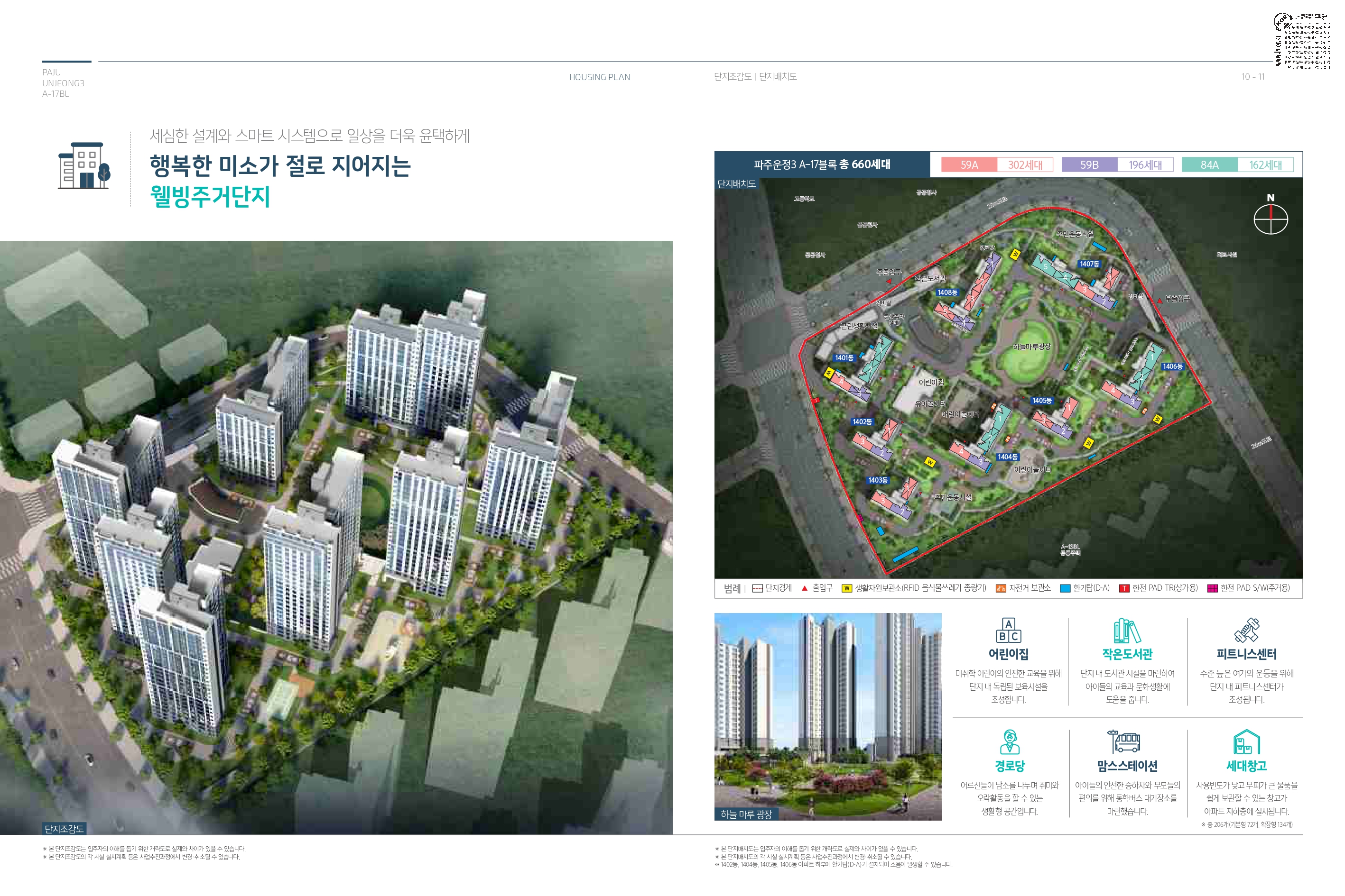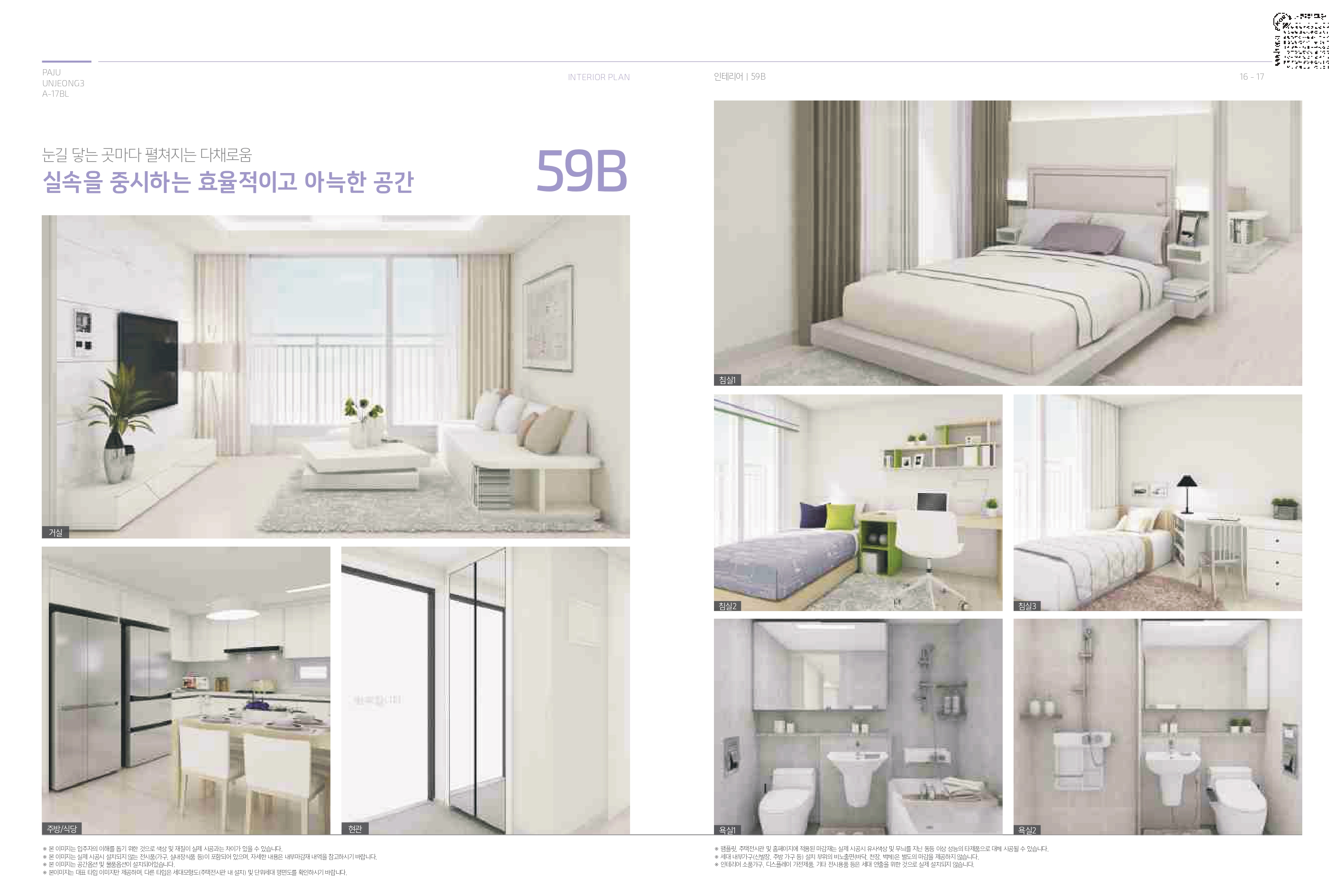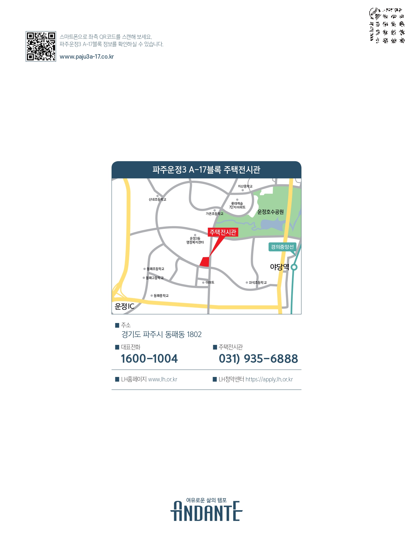 - 파주운정3 A17블록 주택전시관 내 견본주택은 단위세대 59A형, 84A형이 설치되었으며, 59B형은 파주운정3 A17블록 공식홈페이지에서 사이버모델하우스를 참고하시기 바랍니다.