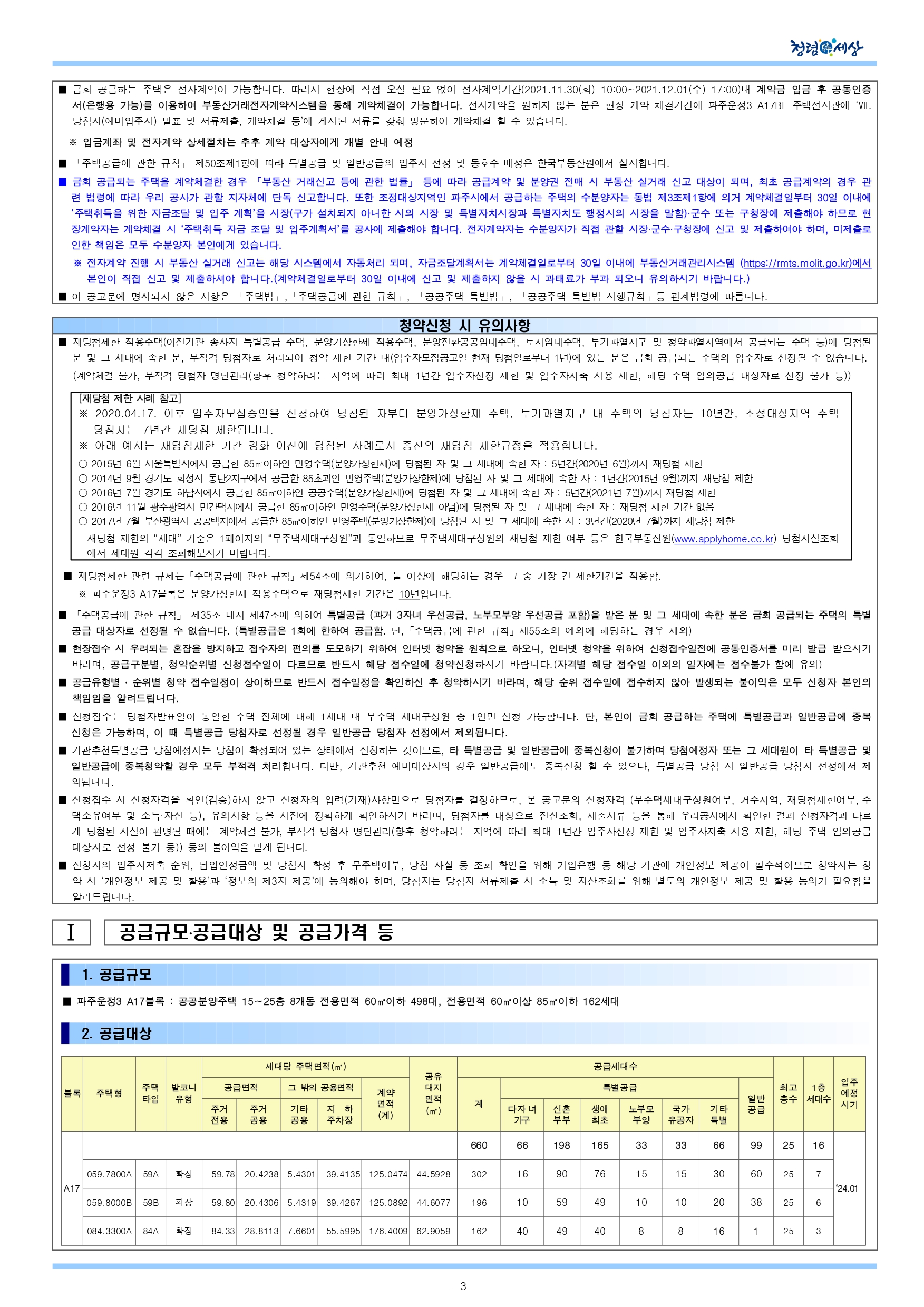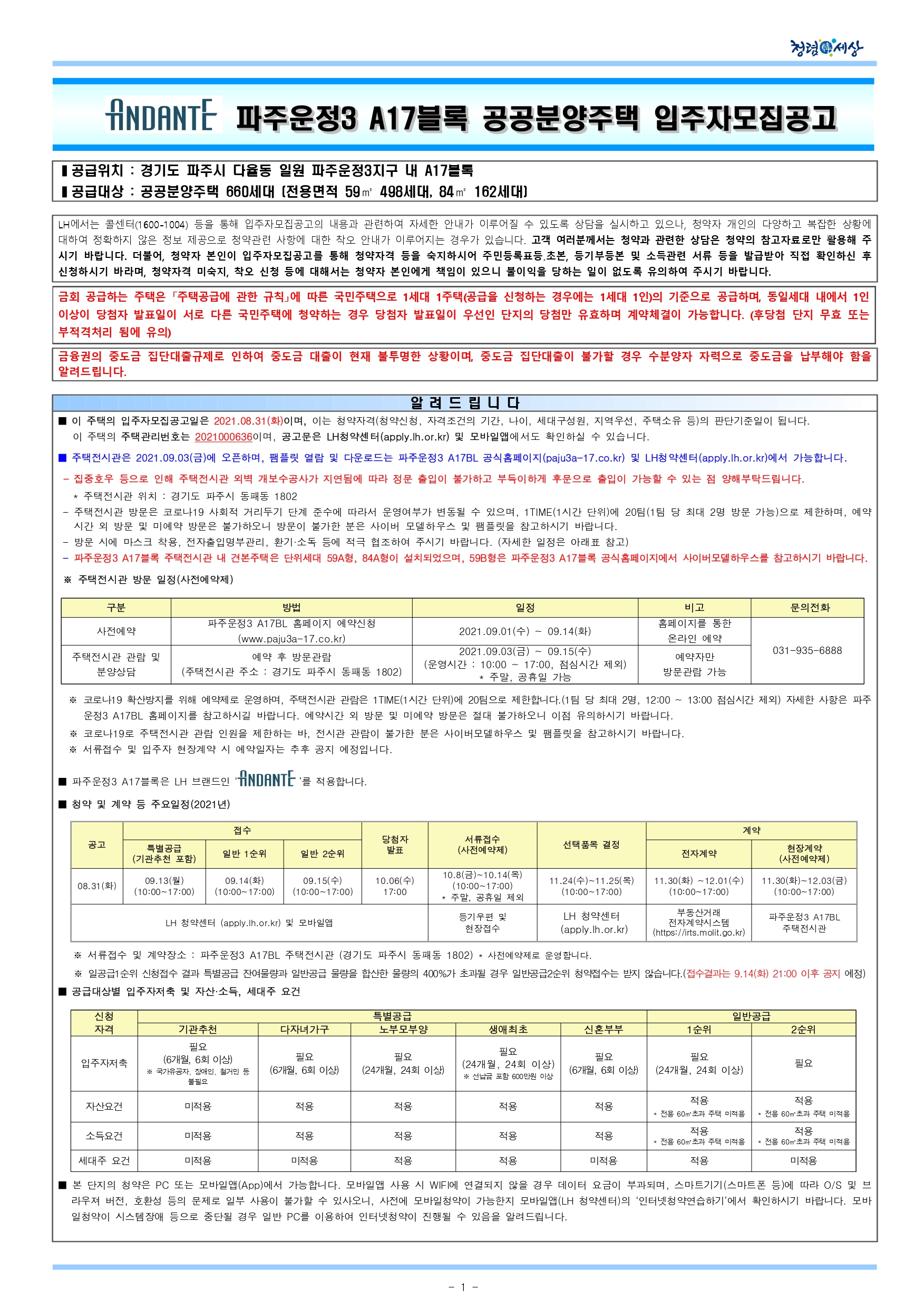 파주 운정3 A17블록 공공분양주택 입주자 모집공고(8.31) 입니다.