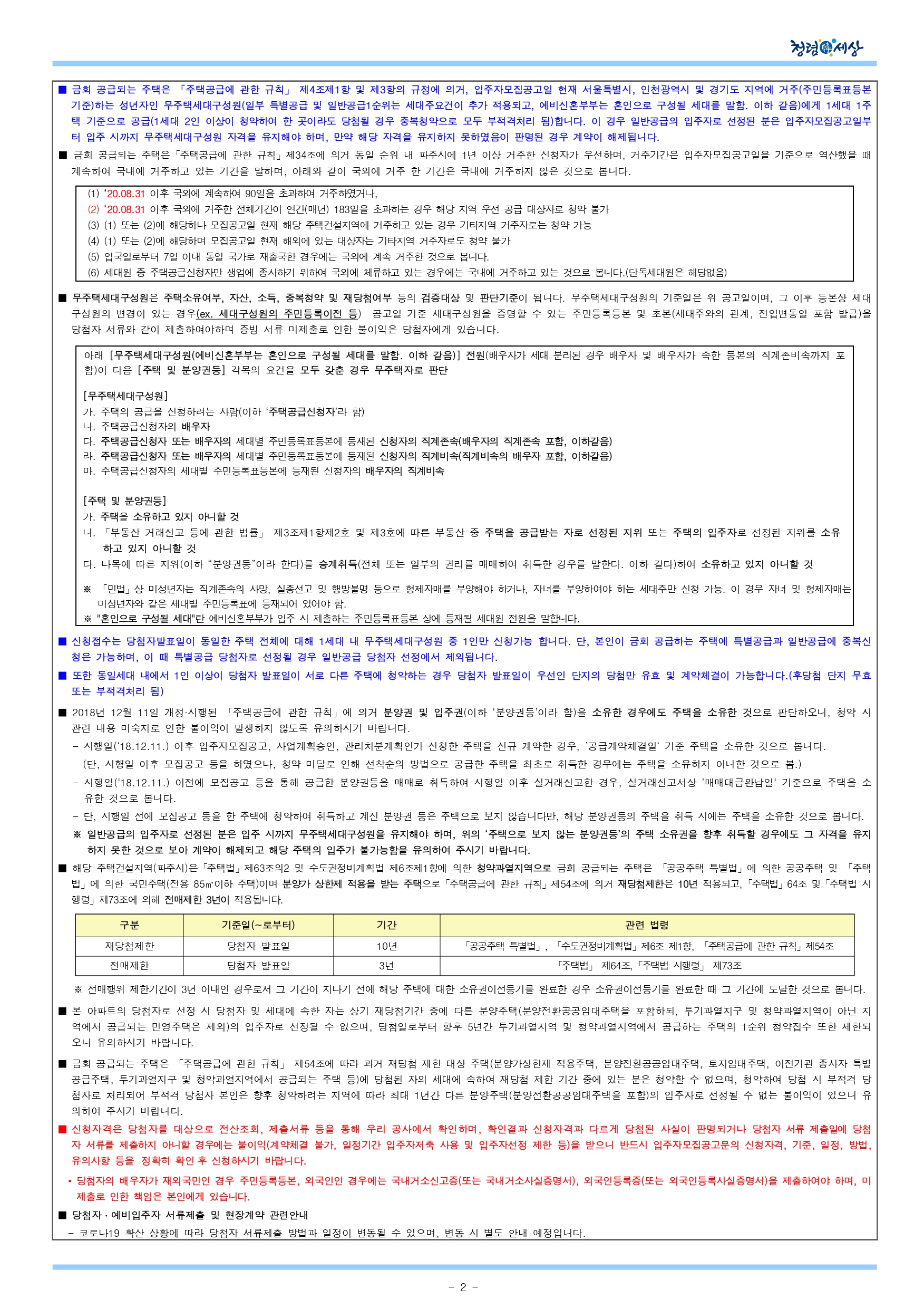 ■ 금회 공급되는 주택은 「주택공급에 관한 규칙」 제4조제1항 및 제3항의 규정에 의거, 입주자모집공고일 현재 서울특별시, 인천광역시 및 경기도 지역에 거주(주민등록표등본 기준)하는 성년자인 무주택세대구성원(일부 특별공급 및 일반공급1순위는 세대주요건이 추가 적용되고, 예비신혼부부는 혼인으로 구성될 세대를 말함. 이하 같음)에게 1세대 1주택 기준으로 공급(1세대 2인 이상이 청약하여 한 곳이라도 당첨될 경우 중복청약으로 모두 부적격처리 됨)합니다.