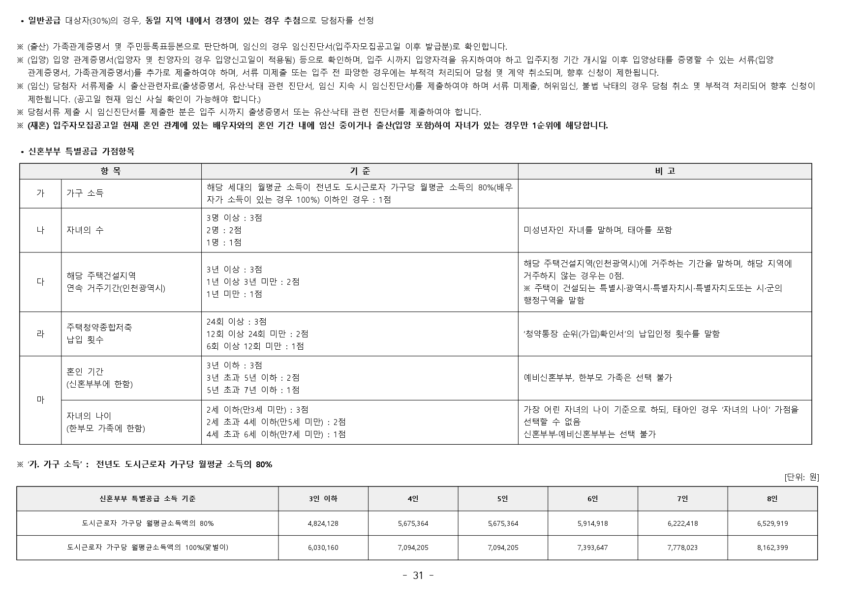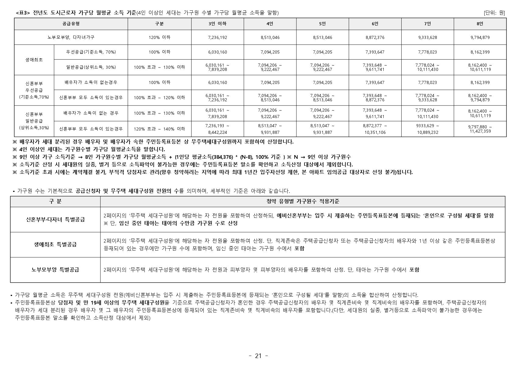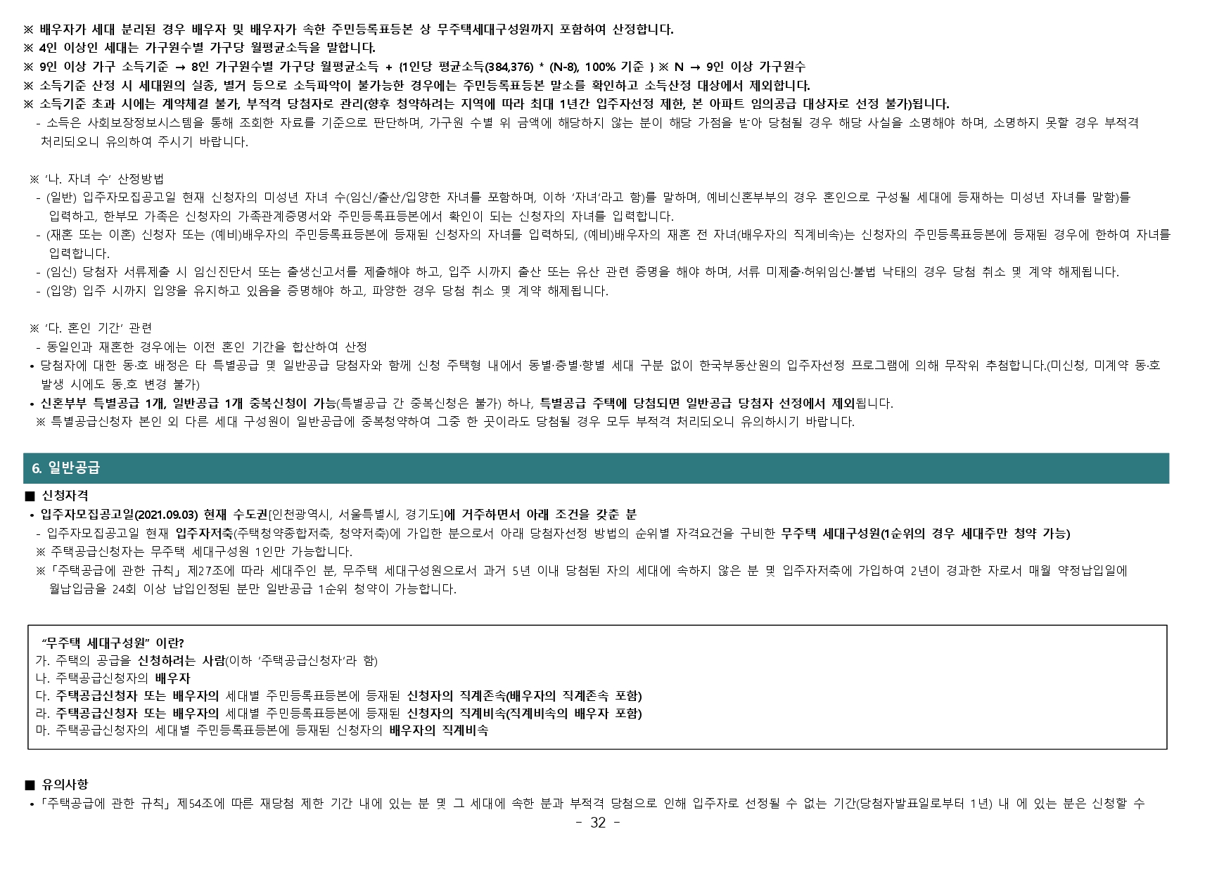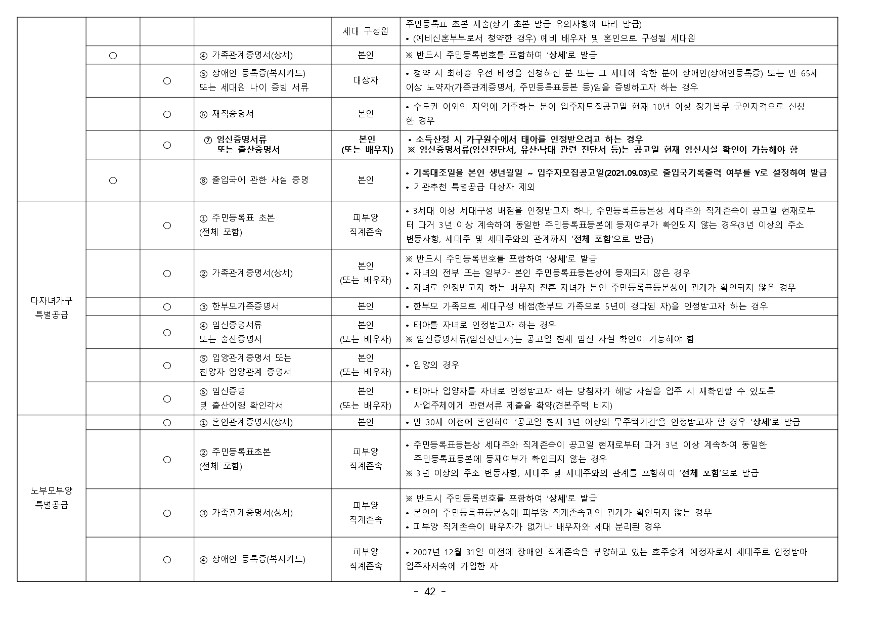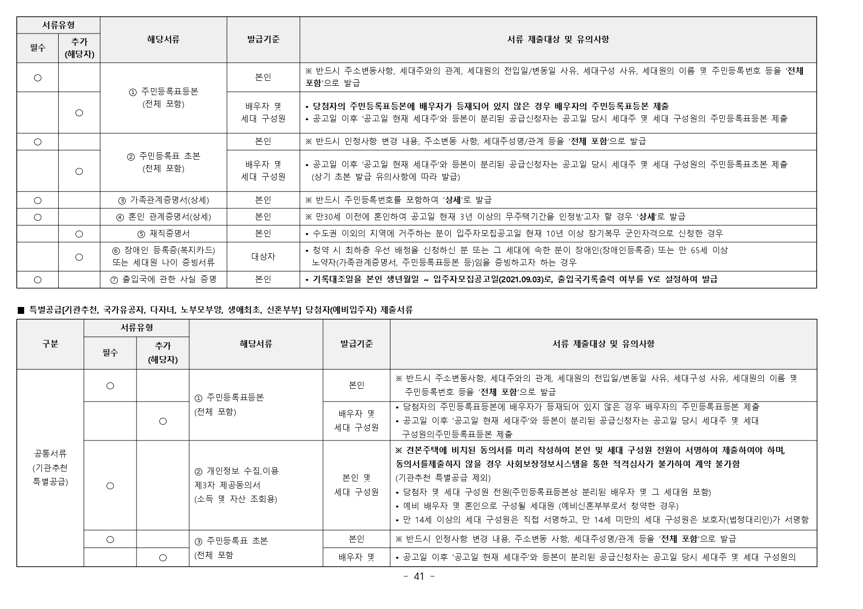 ■ 무주택 세대구성원은 주택소유 여부, 자산, 소득, 중복청약 및 재당첨 여부 등의 검증대상 및 판단기준이 됩니다. 무주택 세대구성원의 기준일은 위 공고일이며, 그 이후 등본상 세대 구성원의 변경이 있는 경우(ex. 세대 구성원의 주민등록 이전 등) 공고일 기준 세대 구성원을 증명할 수 있는 주민등록표등본 및 초본(세대주와의 관계, 전입변동일 포함 발급)을 당첨자 서류와 같이 제출하여야 하며 증빙 서류 미제출로 인한 불이익은 당첨자에게 있습니다.