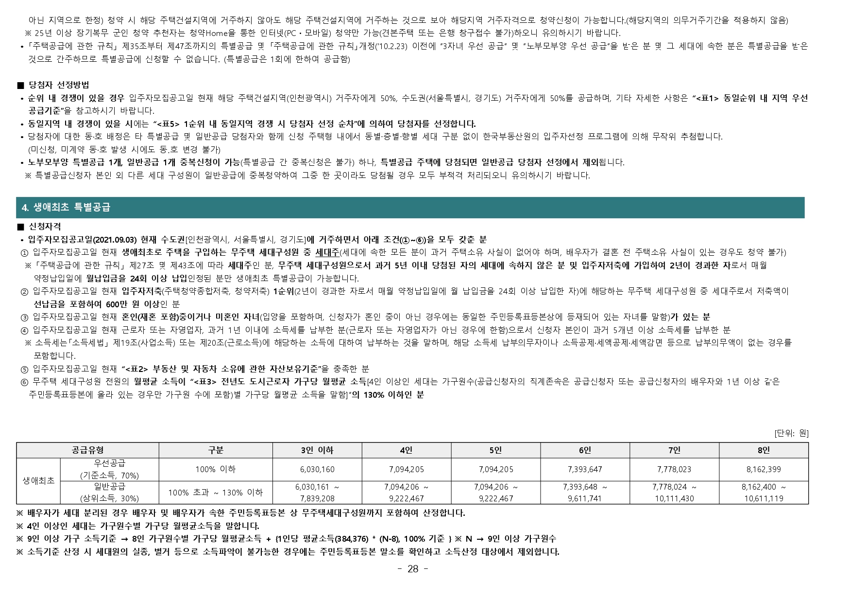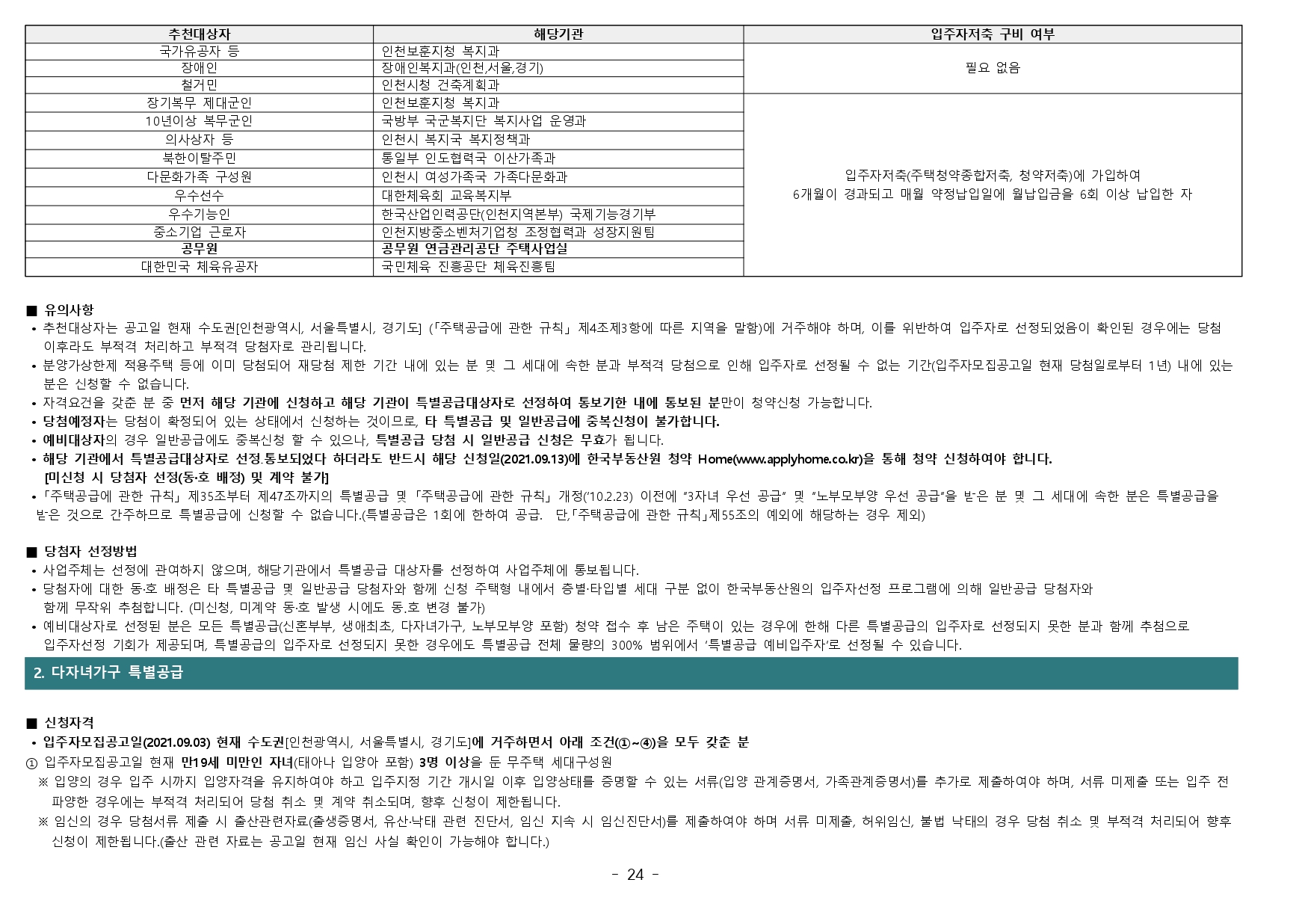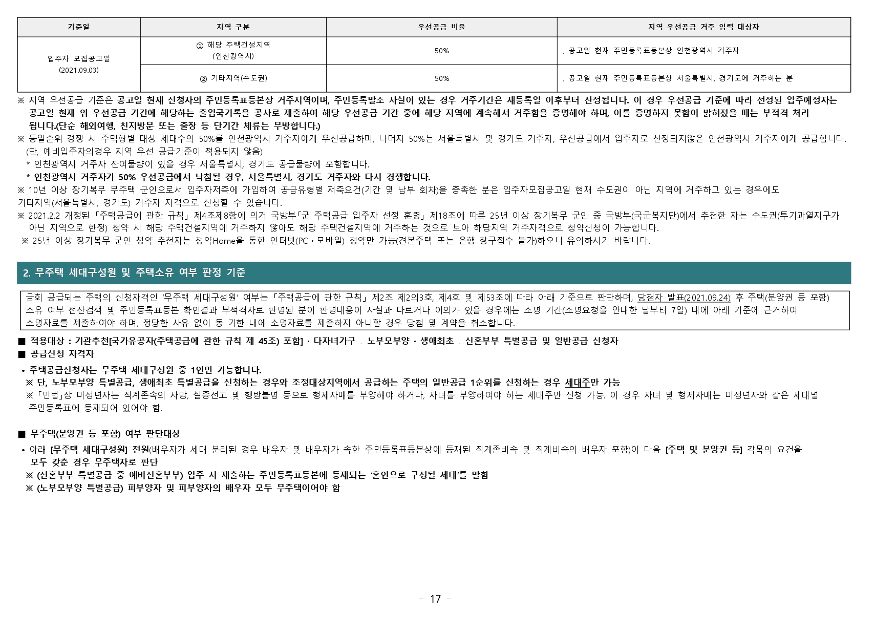 ■ 금회 공급되는 주택은 「주택공급에 관한 규칙」 제4조 제1항 및 제3항의 규정에 의거, 입주자모집공고일 현재 인천광역시, 서울특별시, 경기도 지역에 거주(주민등록표등본 기준) 하는 성년자인 무주택 세대구성원(예비신혼부부는 혼인으로 구성될 세대를 말함. 이하 같음)에게 1세대 1주택 기준으로 공급(1세대 2인 이상이 청약하여 한 곳이라도 당첨될경우 중복청약으로 모두 부적격처리 됨)합니다. 이 경우 일반공급의 입주자로 선정된 분은 입주자모집공고일부터 입주 시까지 무주택 세대구성원 자격을 유지해야 하며, 만약 해당자격을 유지하지 못하였음이 판명된 경우 계약이 해제됩니다.