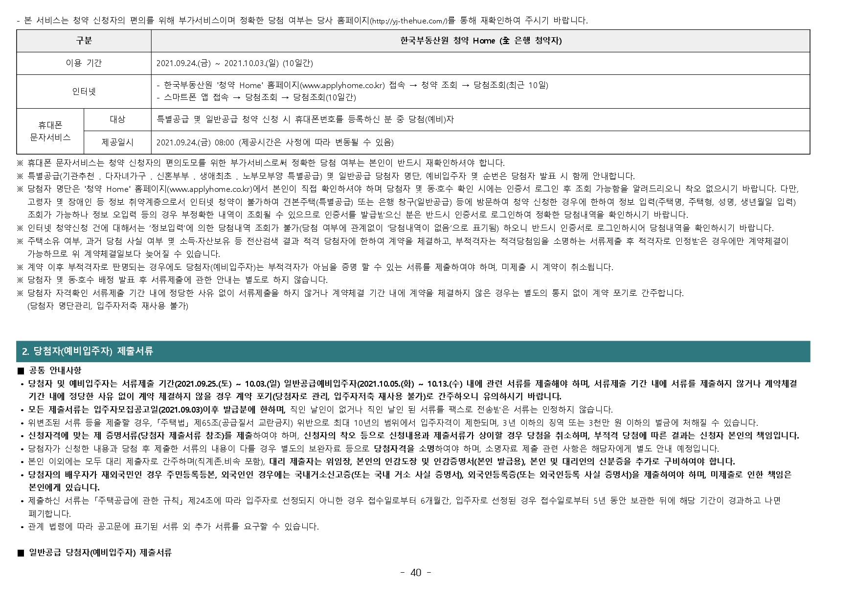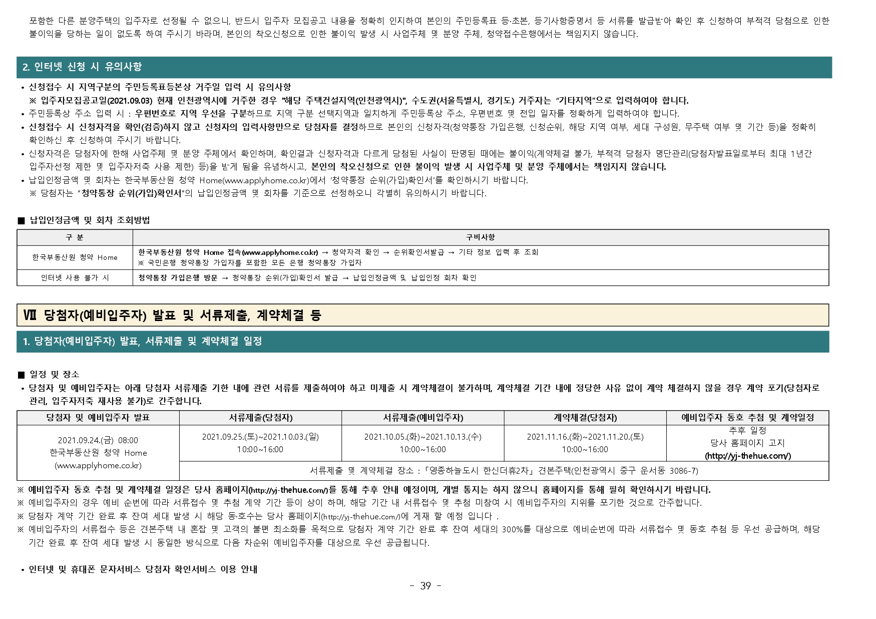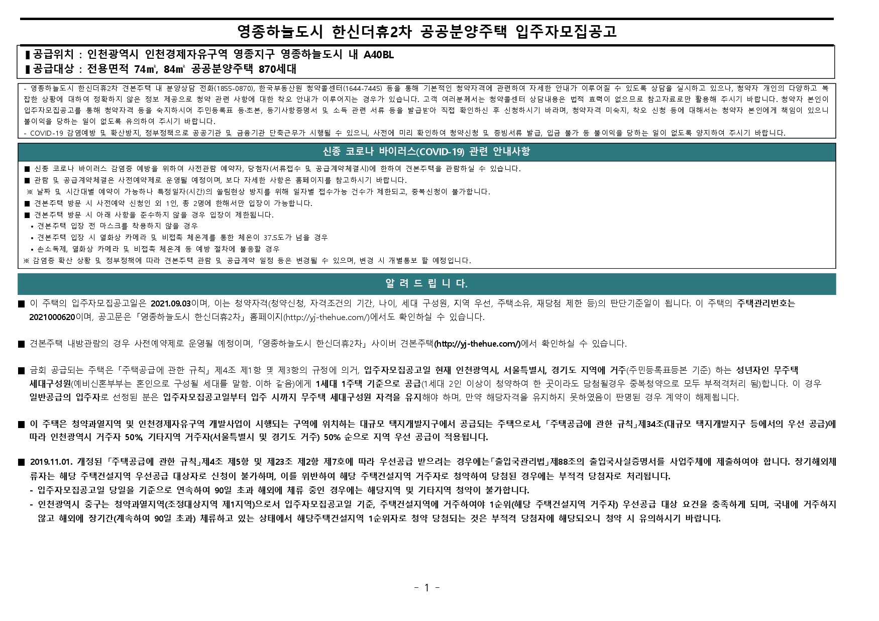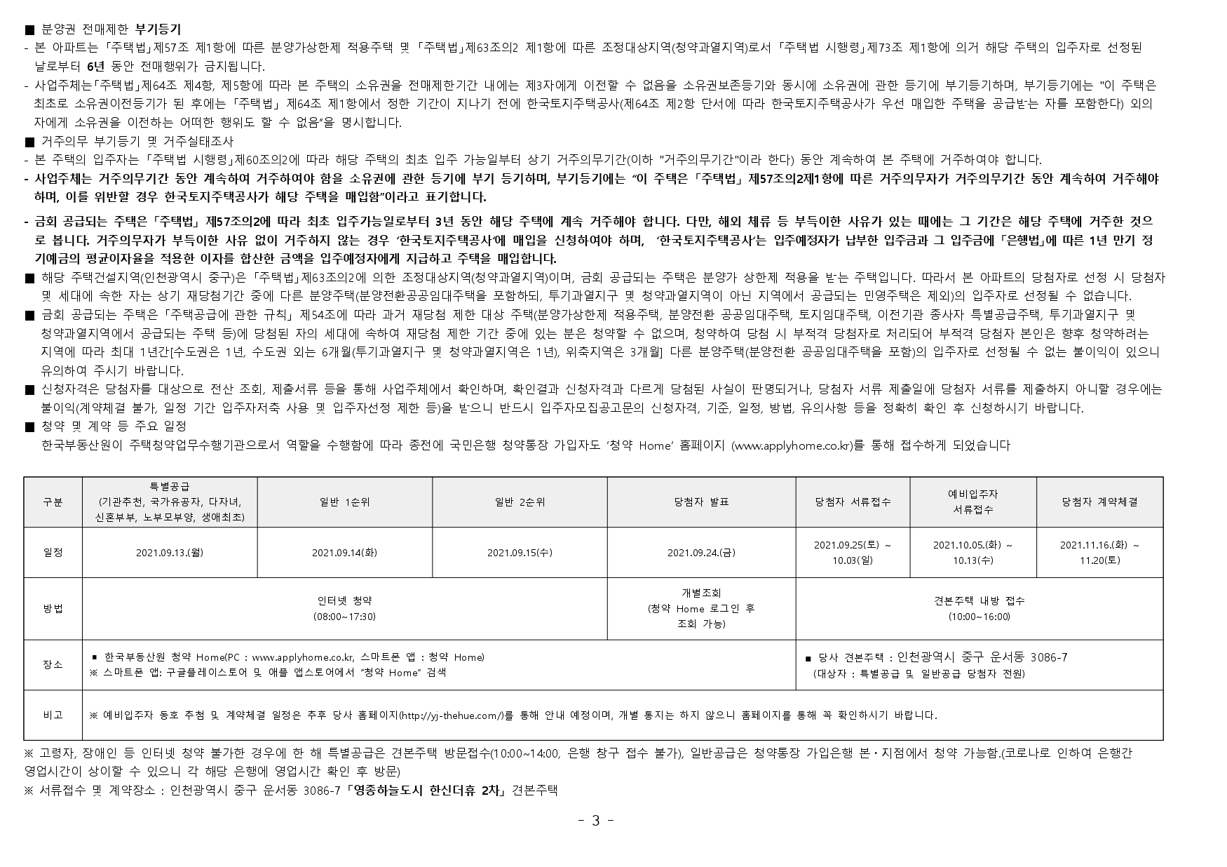 ■ 이 주택의 입주자모집공고일은 2021.09.03이며, 이는 청약자격(청약신청, 자격조건의 기간, 나이, 세대 구성원, 지역 우선, 주택소유, 재당첨 제한 등)의 판단기준일이 됩니다. 이 주택의 주택관리번호는 2021000620이며, 공고문은 「영종하늘도시 한신더휴2차」 홈페이지(http://yj-thehue.com/)에서도 확인하실 수 있습니다.