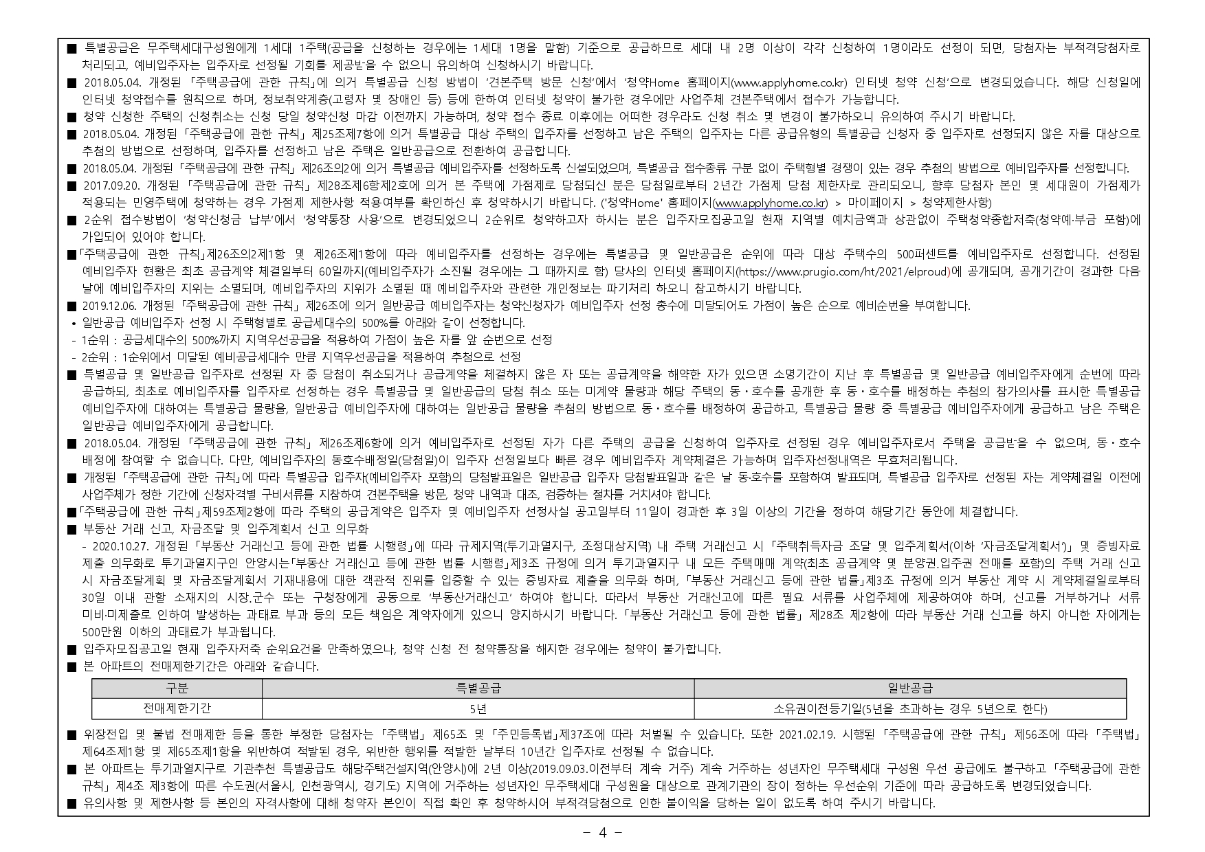 - 특별공급 주택 : 특별공급으로 주택을 공급받은 경우 「주택법」제64조 및 「주택법 시행령」 제73조 및 동법 별표3에 의거 주택 공급 입주자로 선정된 날부터 5년간 전매가 금지됩니다. (단, 향후 「주택법」 및 관련법령 개정에 따라 조정될 수 있음)