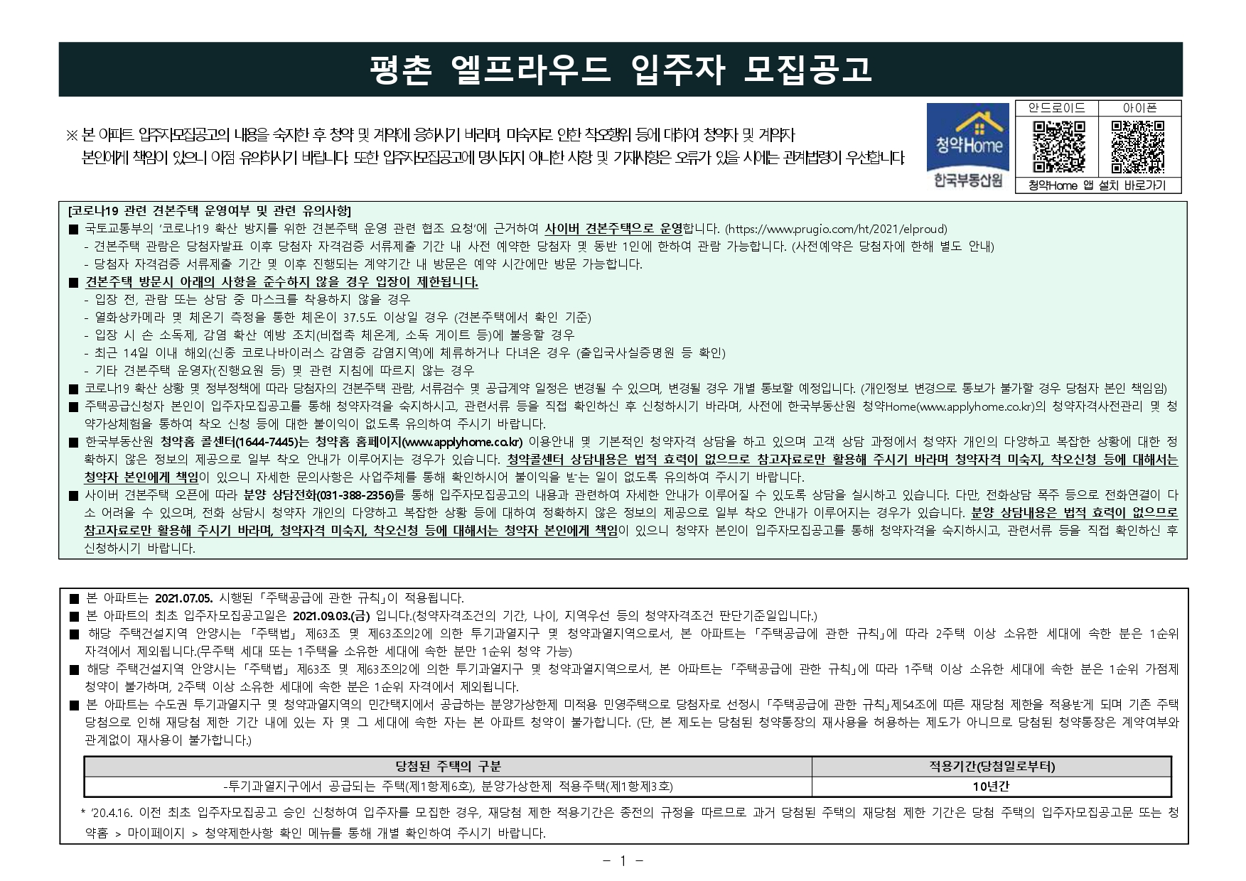 ■ 본 아파트의 최초 입주자모집공고일은 2021.09.03.(금) 입니다.(청약자격조건의 기간, 나이, 지역우선 등의 청약자격조건 판단기준일입니다.)