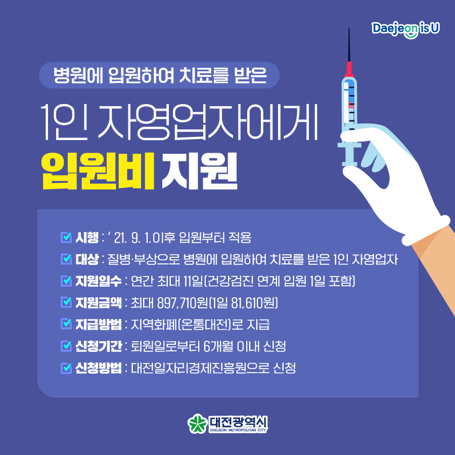 9월부터 대전형 유급병가제 시행. 건강보험 지역가입자 중 기준 중위소득 150% 이하인 1인 자영업자로 몸이 아파 병원에 입원할 시 하루 8만 1610원씩 최대 11일(89만 7710원) 동안 지원.