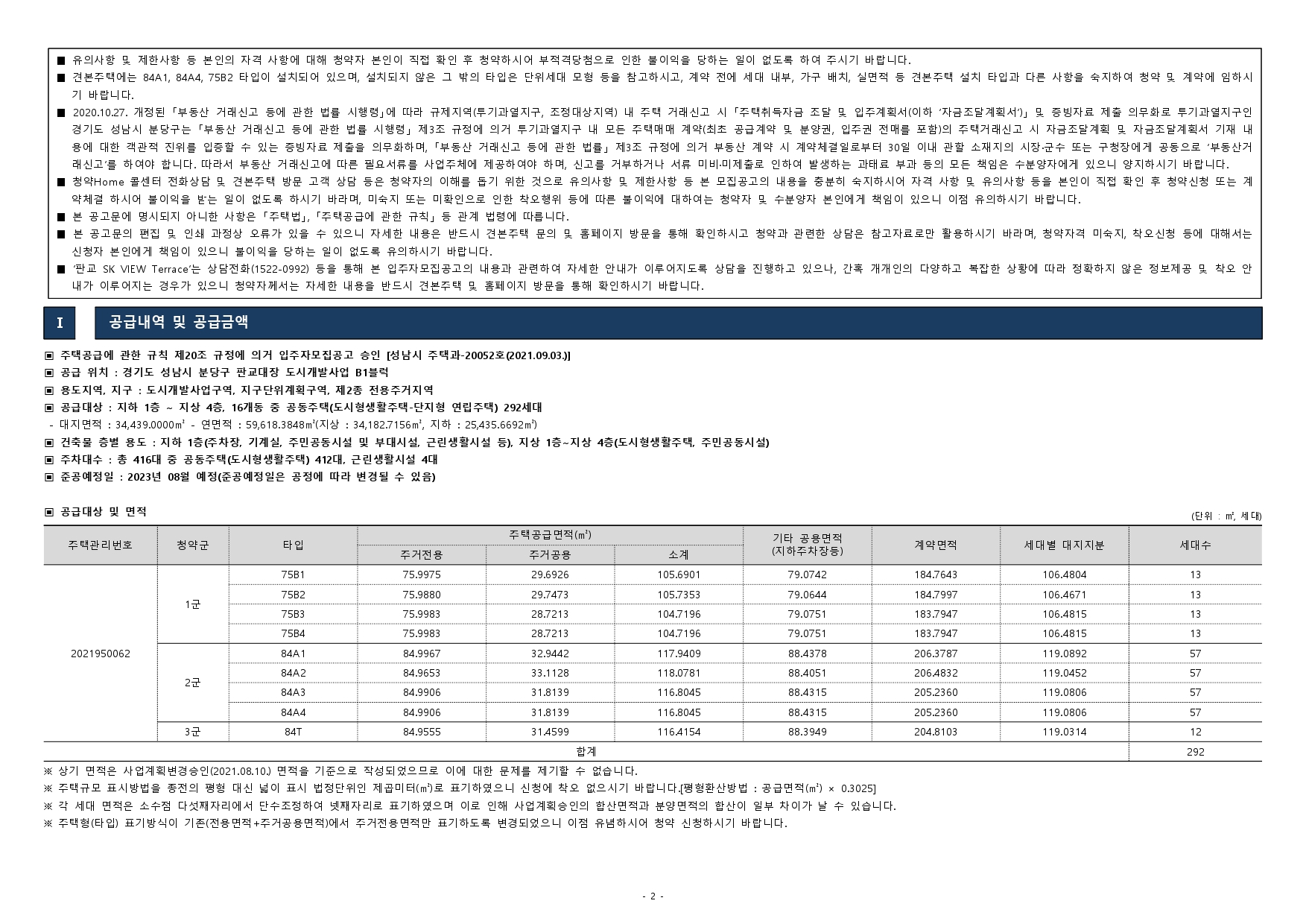 ■ ‘판교 SK VIEW Terrace’는 상담전화(1522-0992) 등을 통해 본 입주자모집공고의 내용과 관련하여 자세한 안내가 이루어지도록 상담을 진행하고 있으나, 간혹 개개인의 다양하고 복잡한 상황에 따라 정확하지 않은 정보제공 및 착오 안 내가 이루어지는 경우가 있으니 청약자께서는 자세한 내용을 반드시 견본주택 및 홈페이지 방문을 통해 확인하시기 바랍니다.