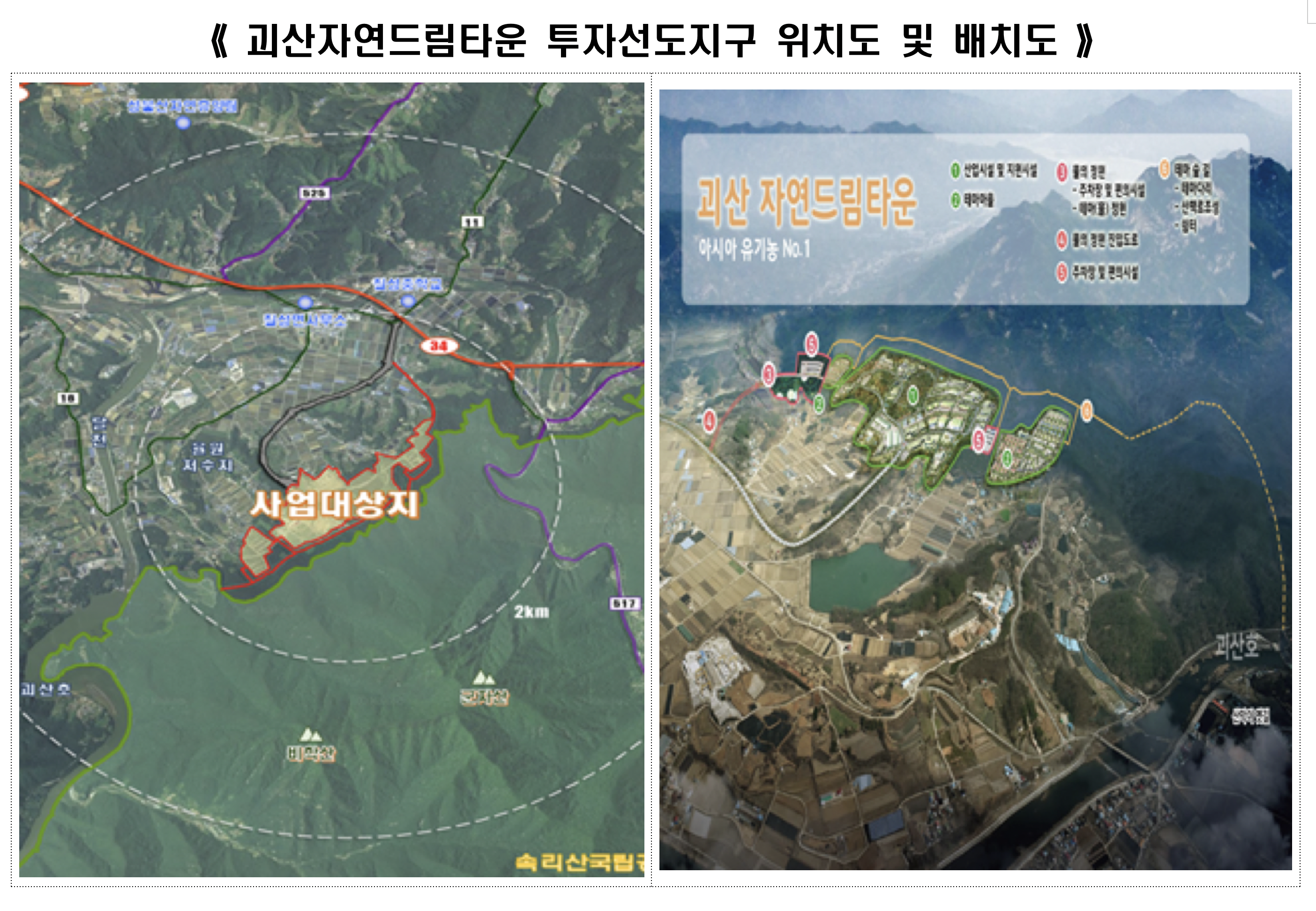 괴산 자연드림타운 투자선도지구는 지역 유기농식품을 생산, 가공, 판매하는 유기농산업단지와 주거․관광을 결합한 복합 유기농타운을 조성하는 사업이다. 괴산군과 아이쿱생산자협동조합*이 862,387㎡부지에 2,556억원을 투자하여 주변 관광자원과 연계하여 지역 문화·산업의 성장거점으로 육성할 계획이다.