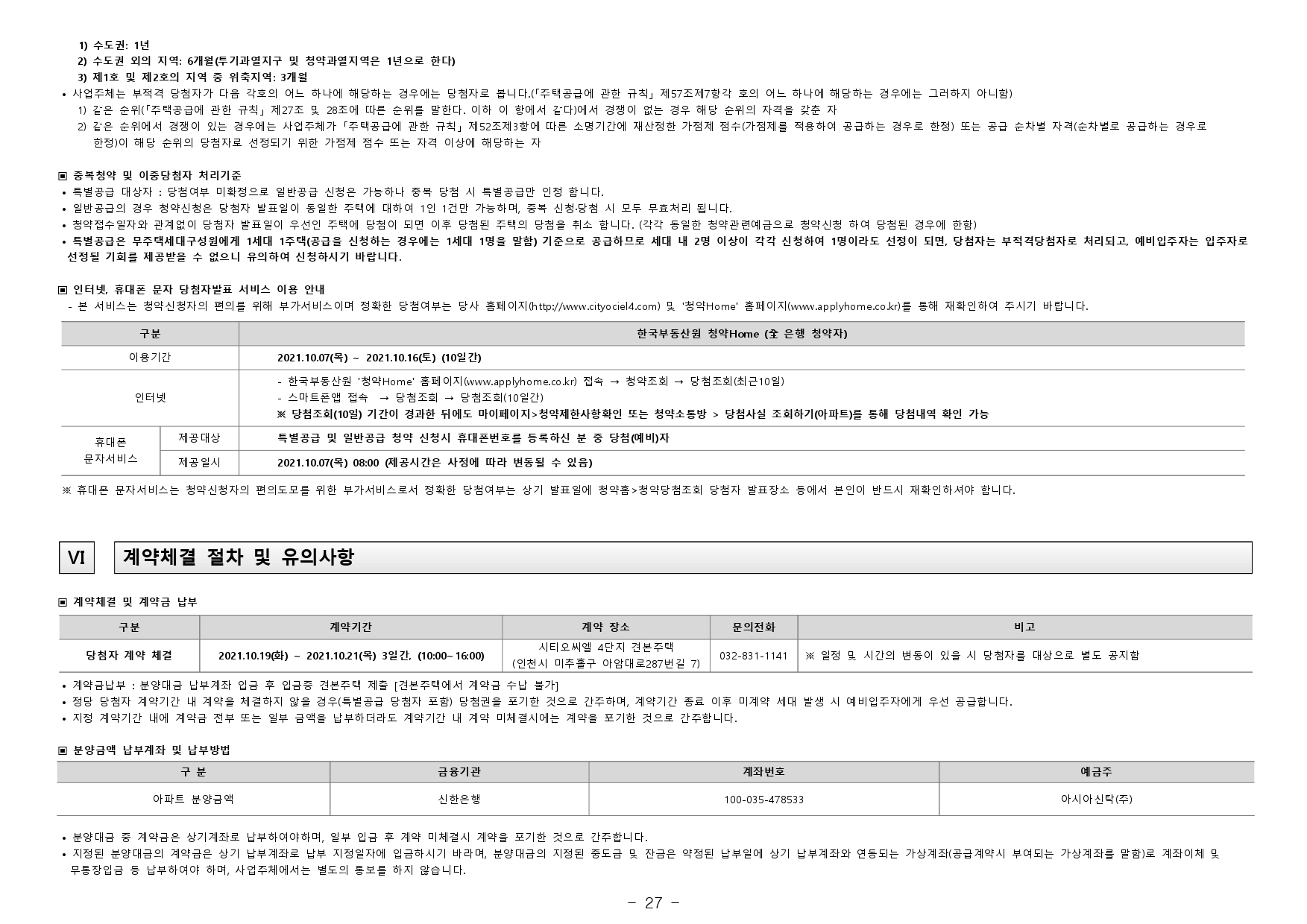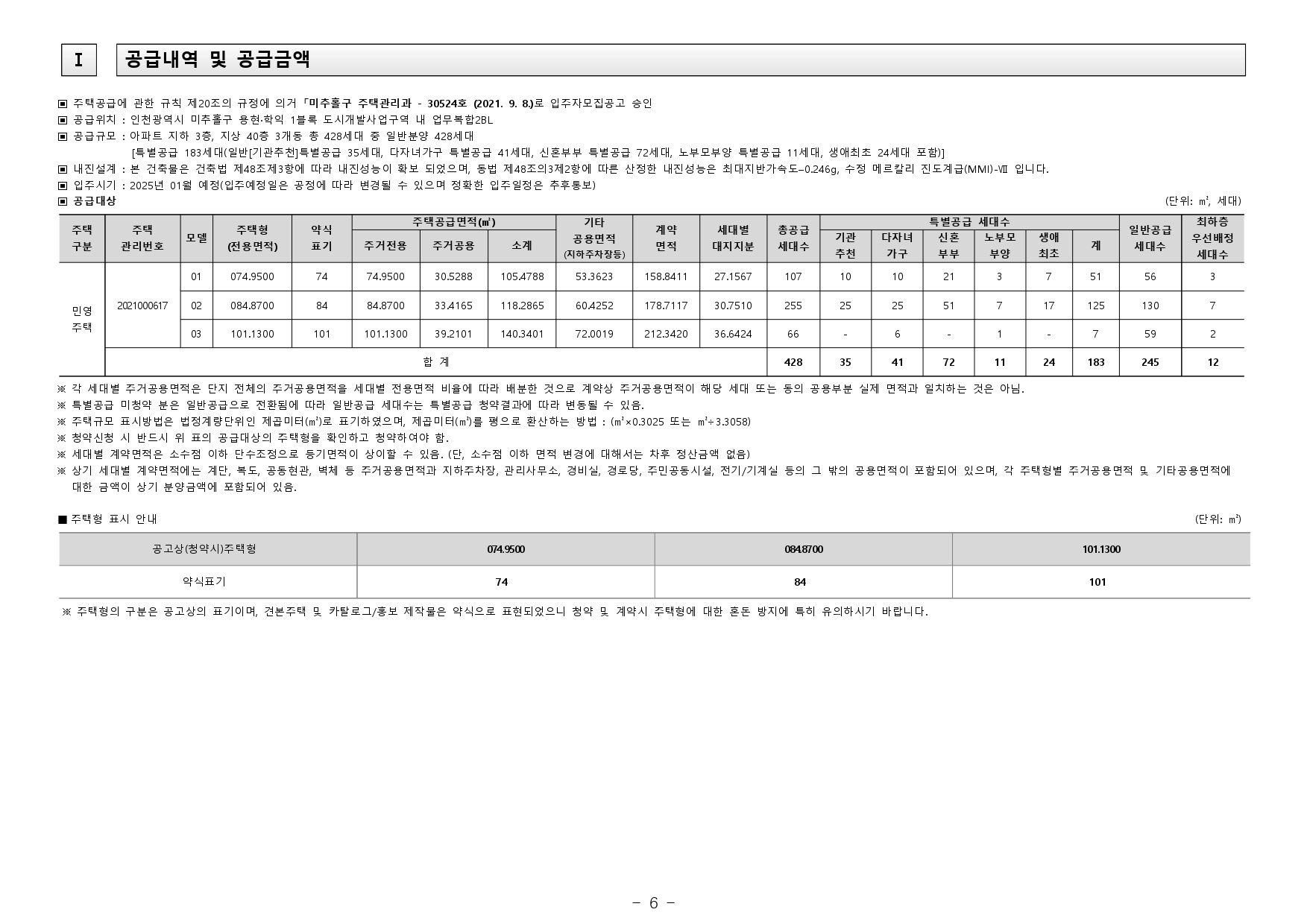 ■ 해당 주택건설지역(인천시 미추홀구)은 「주택법」 제63조 및 제63조의2에 의한 비투기과열지구 및 청약과열지역으로서, 본 아파트는 「주택공급에 관한 규칙」에 따라 1주택 이상 소유한 세대에 속한 분은 1순위 가점제 청약이 불가하며, 2주택 이상 소유한 세대에 속한 분은 1순위 자격에서 제외됩니다.