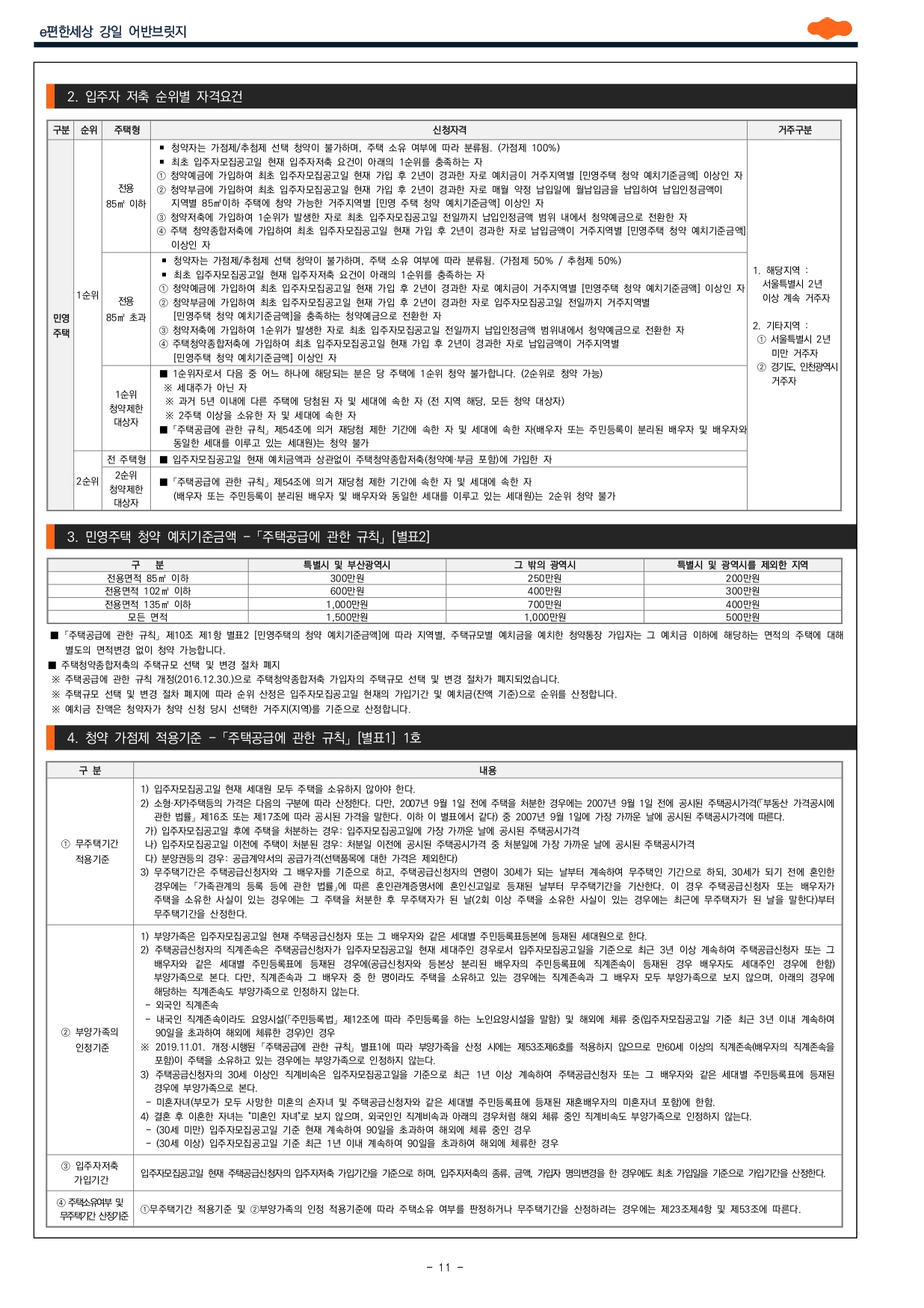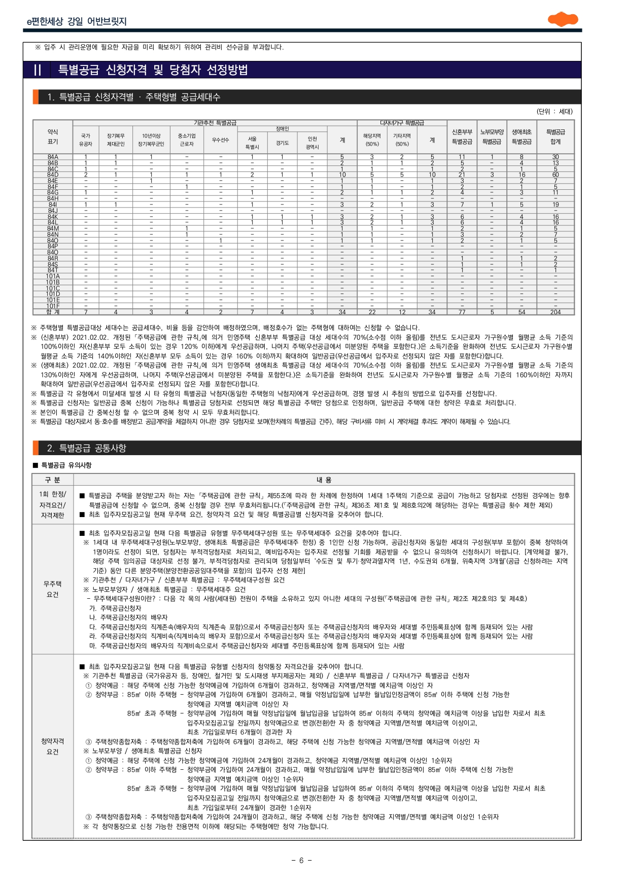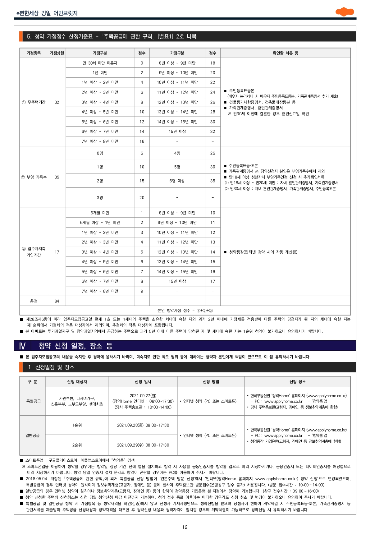 ■ 본 아파트는 「주택공급에 관한 규칙」 제28조에 의거 ‘무주택기간, 부양가족수, 주택청약종합저축 가입기간’을 적용하여 산정한 점수로 입주자를 선정하는 ‘가점제’가 적용됩니다. (주택형 85㎡ 이하 주택은 일반공급 세대수의 100%를 가점제로, 주택형 85㎡ 초과 주택은 일반공급 세대수의 50%를 가점제로, 나머지 50%는 추첨제로 입주자를 선정합니다)