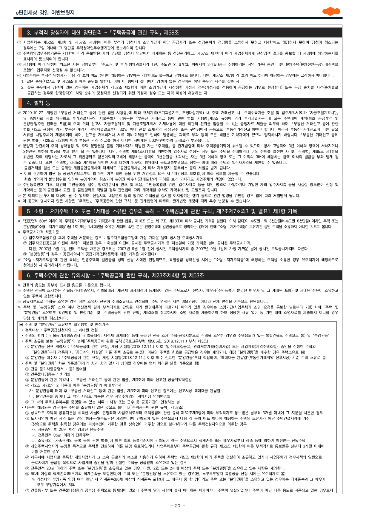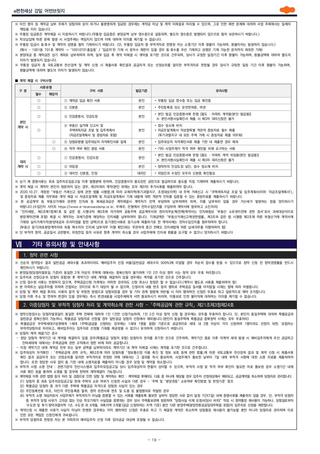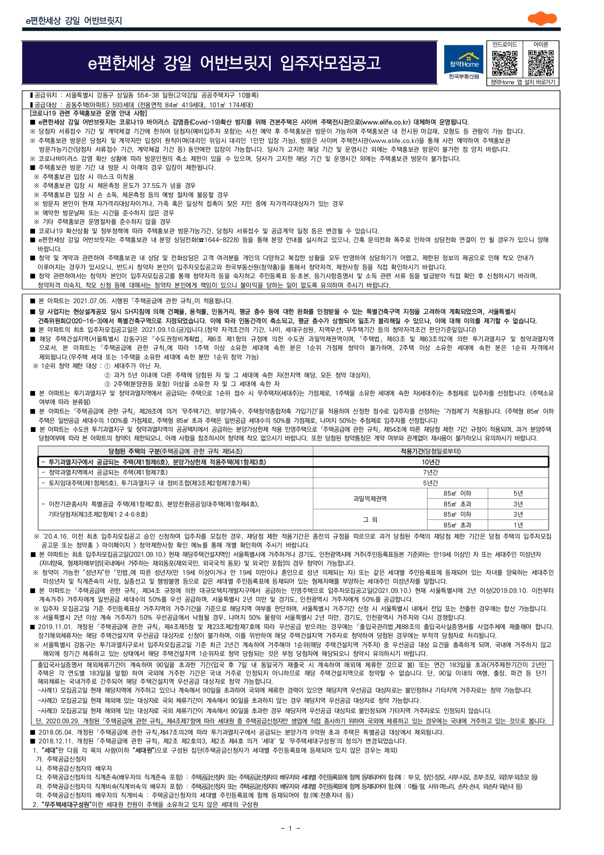 ■ 2019.11.01. 개정된 「주택공급에 관한 규칙」 제4조제5항 및 제23조제2항제7호에 따라 우선공급 받으려는 경우에는 「출입국관리법」제88조의 출입국사실증명서를 사업주체에 제출해야 합니다. 장기해외체류자는 해당 주택건설지역 우선공급 대상자로 신청이 불가하며, 이를 위반하여 해당 주택건설지역 거주자로 청약하여 당첨된 경우에는 부적격 당첨자로 처리됩니다. ※ 서울특별시 강동구는 투기과열지구로서 입주자모집공고일 기준 최근 2년간 계속하여 거주해야 1순위(해당 주택건설지역 거주자) 중 우선공급 대상 요건을 충족하게 되며, 국내에 거주하지 않고 해외에 장기간 체류하고 있는 상태에서 해당 주택건설지역 1순위자로 청약 당첨되는 것은 부정 당첨자에 해당되오니 청약시 유의하시기 바랍니다.