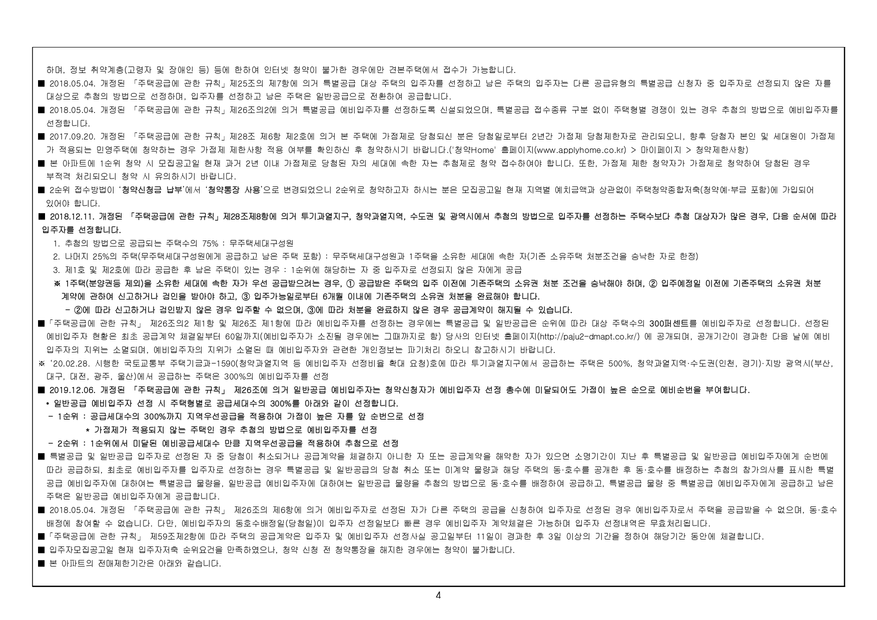 ■ 본 아파트의 당첨자로 선정 시 당첨자 및 세대에 속한 자는 당첨일로부터 향후 5년간 투기과열지구 및 청약과열지역에서 공급하는 주택의 1순위 청약접수가 제한되오니 유의하시기 바랍니다.