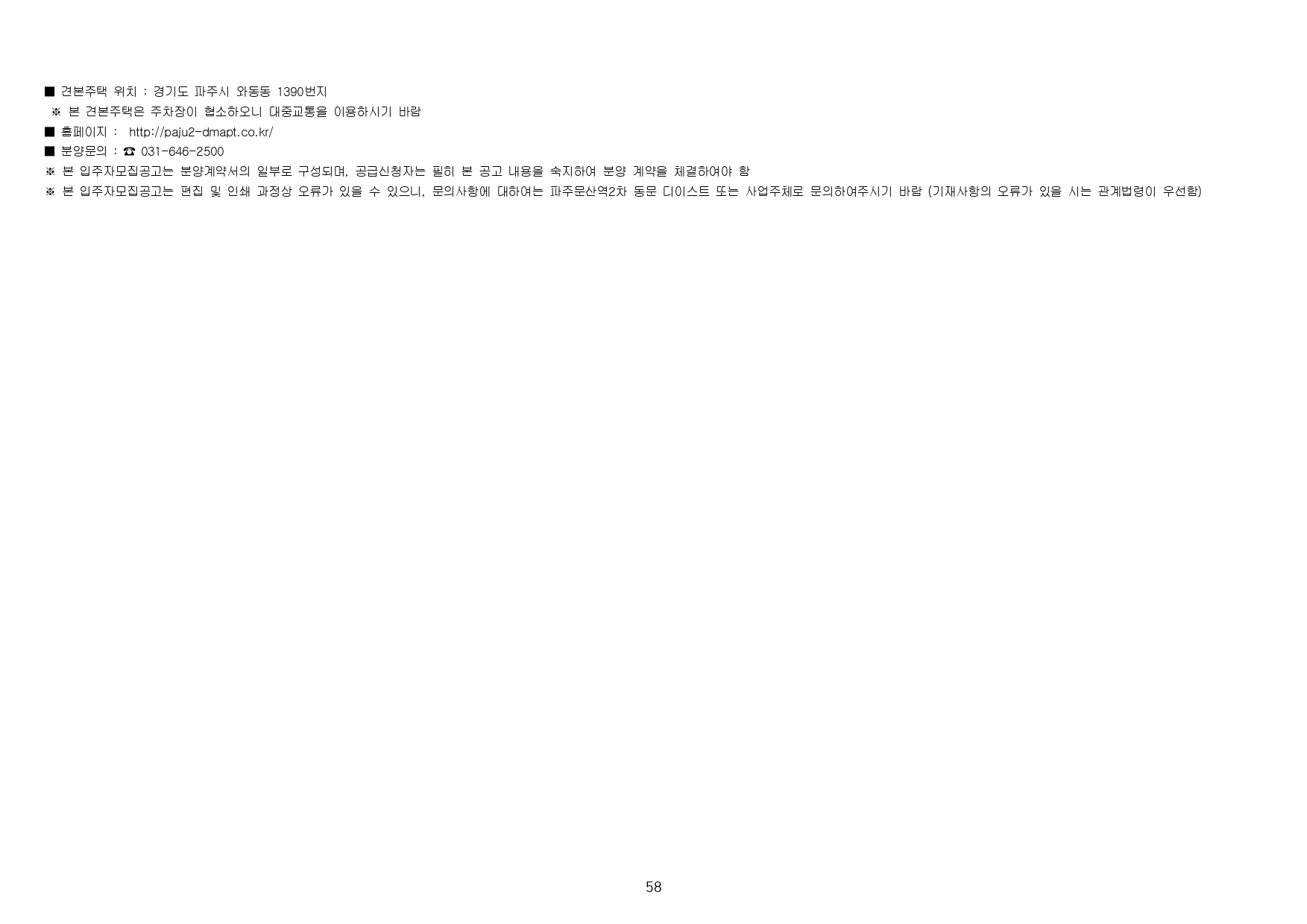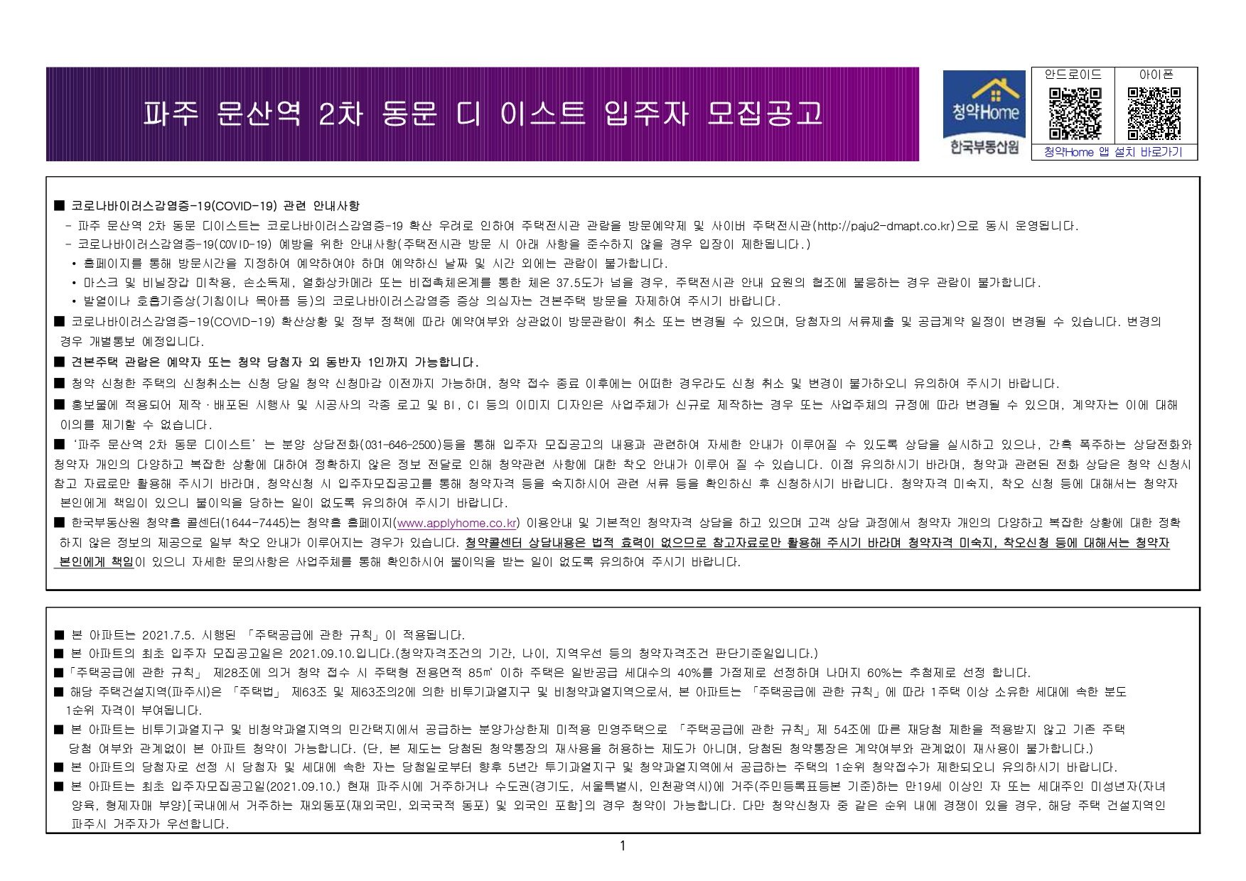 ■ 해당 주택건설지역(파주시)은 「주택법」 제63조 및 제63조의2에 의한 비투기과열지구 및 비청약과열지역으로서, 본 아파트는 「주택공급에 관한 규칙」에 따라 1주택 이상 소유한 세대에 속한 분도 1순위 자격이 부여됩니다.