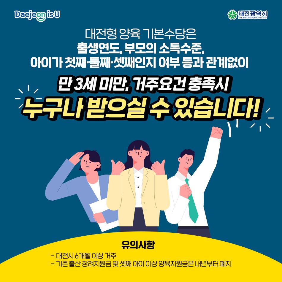 ‘대전형 양육기본수당’으로 출생 후 3년간 매달 30만 원을 지급해드립니다!